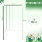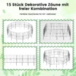 15 dalių dekoratyvinė sodo tvora juodos spalvos – praktiškas ir funkcionalus sprendimas augalų apsaugai sode. Metalinė tvora sujungia patvarumą ir lankstumą, leidžiančią pritaikyti įvairias formas pagal poreikius. Tvorą lengva montuoti be įrankių, ji atspari rūdims ir užtikrina ilgalaikį naudojimą lauke.