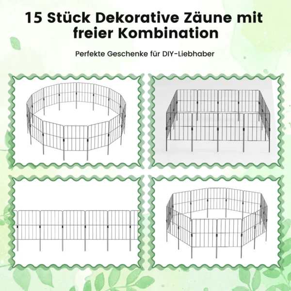 - 15 dalių dekoratyvinė tvora, kurią galima sulankstyti ir sujungti lanksčiomis 360° pasukamomis jungtimis.
