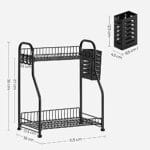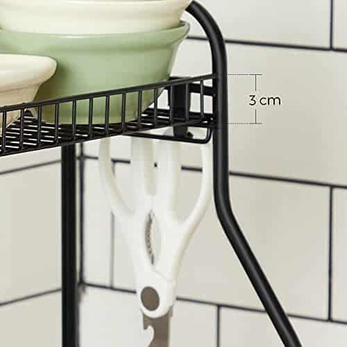 Šios prieskonių lentynėlės privalumai: 31,5 x 18 x 38 cm dydžio, ji užima mažai vietos virtuvėje, tačiau su 2 lentynomis joje yra daug vietos prieskoniams ir pan. Paaukštinti kraštai apsaugo jūsų daiktus nuo kritimo. Nereikia įrankių, kad būtų lengva surinkti. Nuimama šiukšliadėžė ir 3 kabliukai daiktams, pvz., stalo įrankiams, dantų pastai ar šepečiams, laikyti ir pakabinti. Su 4 reguliuojamomis kojelėmis ši lentyna gali stovėti net ant šiek tiek nelygių paviršių stabiliai.