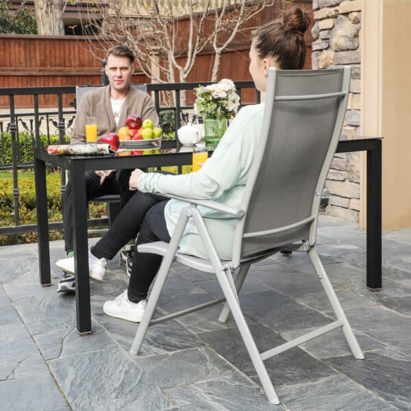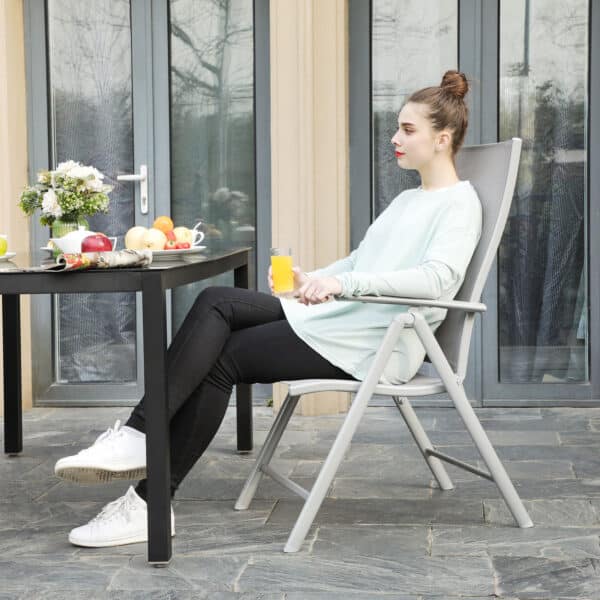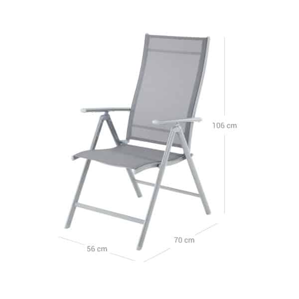 Iš aukštos kokybės sintetinio pluošto audinio pagamintas gulimo paviršius yra pralaidus orui ir jaučiasi patogiai, o aukščiausios kokybės geležinis rėmas užtikrina ilgą tarnavimo laiką. Praktiški porankiai ir reguliuojamas atlošas – šios sodo kėdės yra puiki vieta atsipalaiduoti vasarą, mėgaujantis vėsiais gėrimais arba stebint nuostabų saulėlydį.
