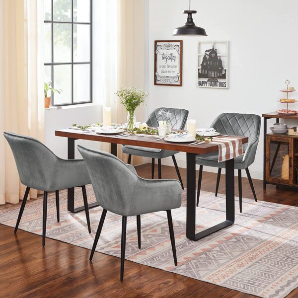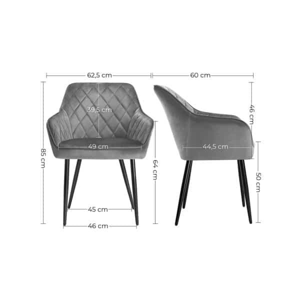 Išbandykite patogumą: Ergonomiškas dizainas, 7 cm storio putplasčio paminkštinimas, aukštos kokybės aksominis užvalkalas ir patvarios metalinės kojelės, kurių apkrova iki 110 kg – šie elementai sukuria tvirtas ir patogias kėdes. Dar geriau, kad kėdės yra gražios išvaizdos, kuri suteikia malonią atmosferą bet kokiam kambariui.