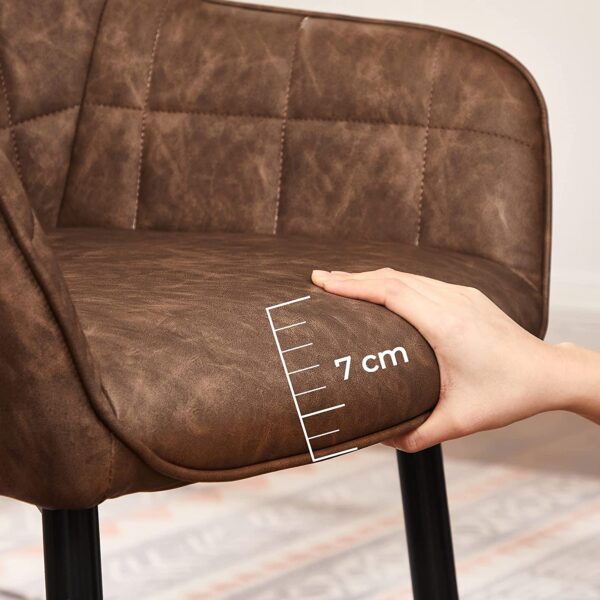 Išbandykite patogumą: Ergonomiškas dizainas, 7 cm storio putplasčio paminkštinimas, aukštos kokybės PU danga ir patvarios metalinės kojos, kurių apkrova iki 110 kg – šie elementai sukuria tvirtas ir patogias kėdes. Dar geriau, kad kėdės yra gražios išvaizdos, kuri suteikia malonią atmosferą bet kokiam kambariui.