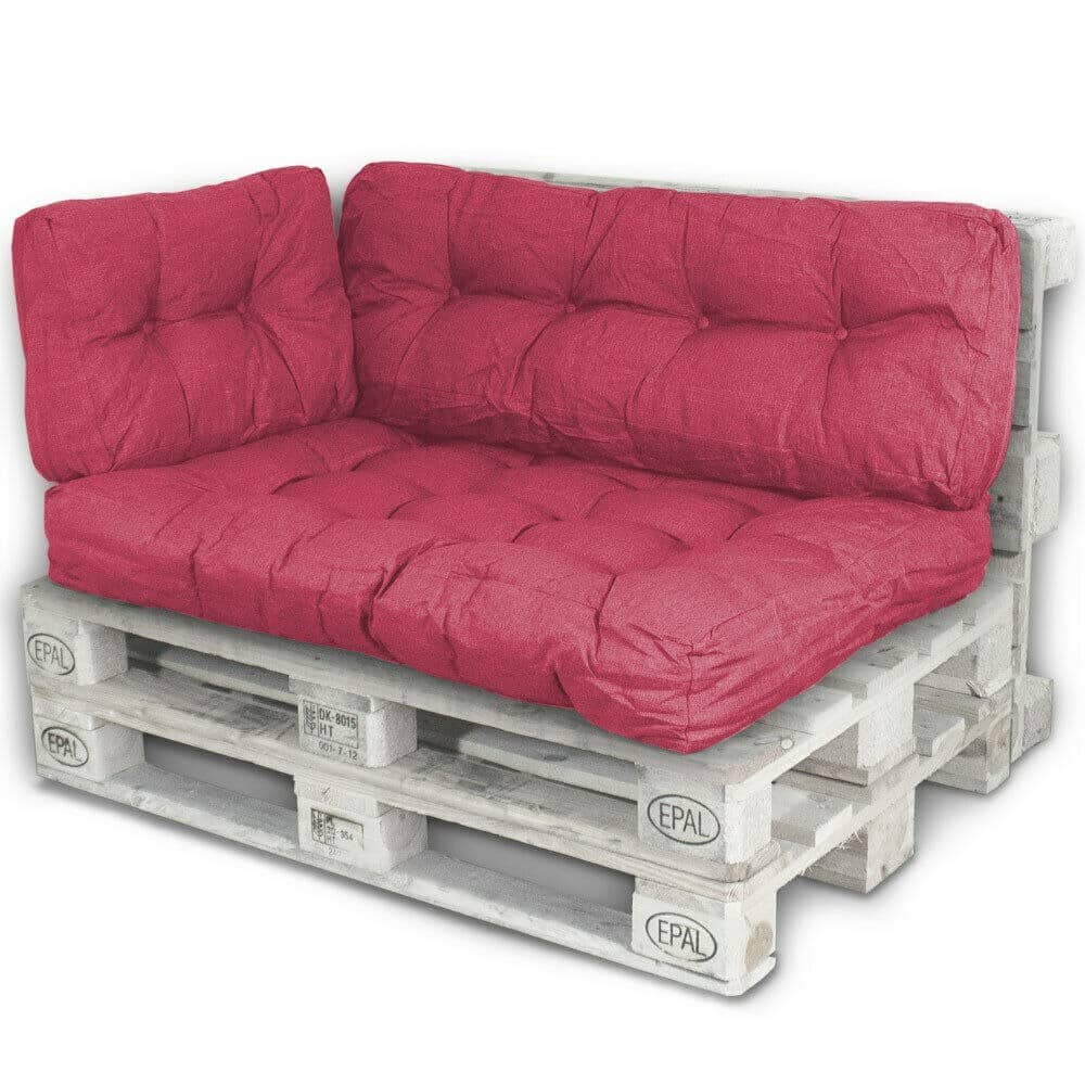 dalių pagalvėlių komplektas suoliukų sofos padėklams. Madingi ir patogūs ;RAUDONA SPALVA Gaminio ypatybės -medžiaga: 70% medvilnė / 30% poliesteris -atspari dėmėms ir nešvarumams -lengva valyti -tinka naudoti viduje ir lauke trz -užpildas- 100% poliuretanas -presavimas iki 110 laipsnių maksimalios temperatūros ° C ; Pagalvėlės matmenys Sėdynės pagalvėlės: 120x80x18cm Nugaros pagalvėlės: 120x40x10 / 20cm Šoninės ir galinės pagalvėlės: 60x40x10 / 20cm