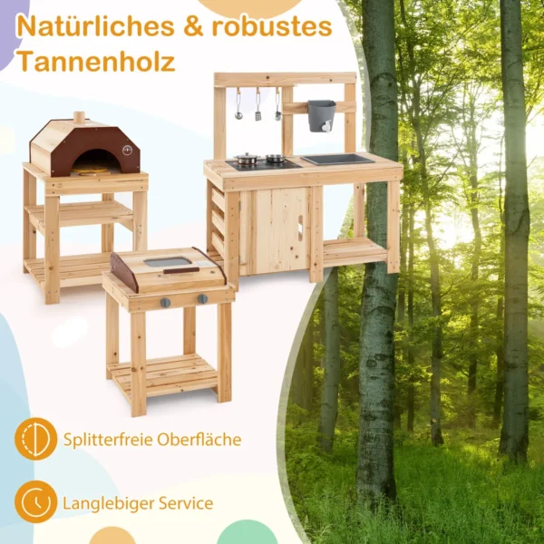 3 dalių vaikų virtuvė šviesiai rudos spalvos yra puikus lauko žaidimų rinkinys, skirtas vaikams nuo 3 metų. Pagaminta iš tvirtos eglės, ši virtuvė su griliu ir picos krosnele skatina vaikų kūrybiškumą bei lavina vaizduotę per vaidmenų žaidimus.