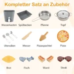 - Į komplektą įeina keptuvė, puodas, stalo įrankiai, picos žievelė, maisto imitacijos.