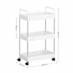 Vežimėlio bendras dydis yra 40 x 22 x 67 cm , o jo svoris siekia tik 1,2 kg, todėl jį lengva perkelti iš vienos vietos į kitą. Kiekvienas lygis gali atlaikyti iki 5 kg statinės apkrovos, todėl galite saugiai laikyti įvairius daiktus.