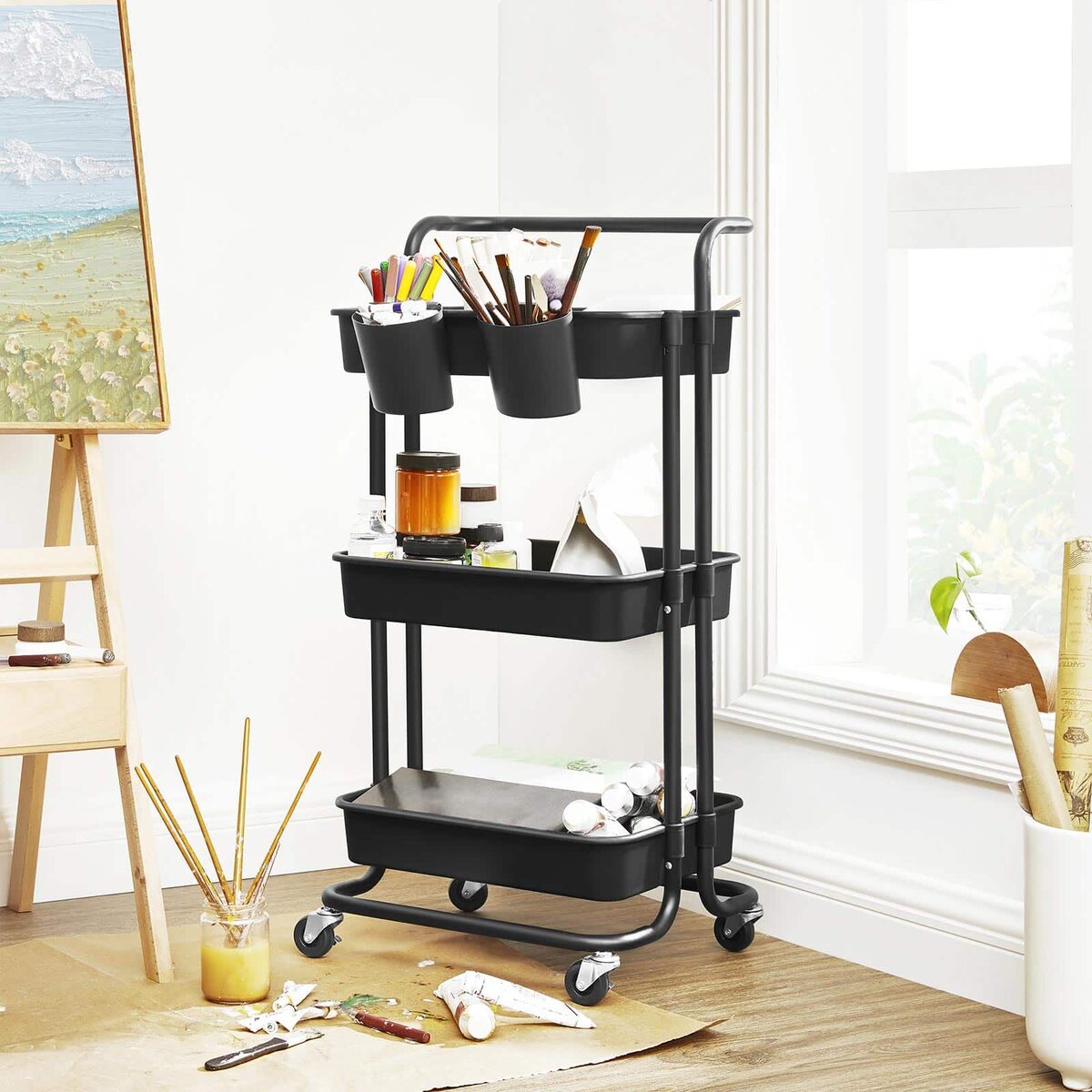 Tvirtas plieninis rėmas, trys plastikinės laikymo lentynos ir keturi aukštos kokybės ratukai (iš kurių du yra užrakinami) – šis SONGMICS 3 lygių vežimėlis su ratukais, juodas, yra puikus sprendimas, kai reikia daugiau vietos.