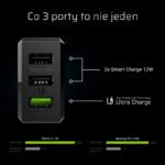 GC ChargeSource3 įkroviklis su 3 sparčiais USB prievadais, kurio bendra galia 30 W – modernus įkroviklis visiems įrenginiams, turintiems USB prievadus.USB-A Ultra Charge prievadas užtikrins iki 3,5 karto greitesnį įkrovimą naujausius išmaniuosius telefonus.Du USB-A Smart prievadai leis kiekvienam prijungtam įrenginiui pritaikyti optimalų įkrovimo greitį.Tvirtas korpusas, puikiai suprojektuotas vidus ir nedideli įkroviklio matmenys garantuoja visiška darbo sauga ir atsparumas įbrėžimams, smūgiams ir kritimams ne tik namuose, bet ir kelionės metu.Produkto savybės:· Galia: 30W· Išėjimas: USB x 3, DC 5V 2.4A x2, DC 12V 1.5A x1· Įvestis: 100 ~ 240V 1A MAX 50 / 60Hz· Prievadai: 3xUSB; 30 W· Suderinamos įkrovimo technologijos: QC 3.0, Samsung AFC, Huawei FCP, Apple 2.4A· Apsauga nuo perkaitimo· Apsauga nuo viršįtampio