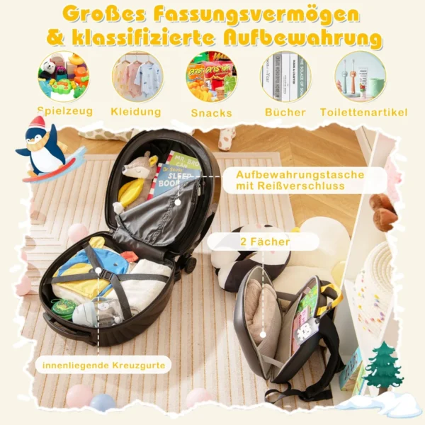 4 dalių vaikiškas bagažo rinkinys juodos ir baltos spalvos skirtas patogiai ir saugiai keliauti vaikams nuo 3 iki 7 metų. Komplekte yra lagaminas, kuprinė, kaklo pagalvė ir vardo etiketė, kurie pagaminti iš tvirtų medžiagų, atlaikančių kelionių iššūkius.