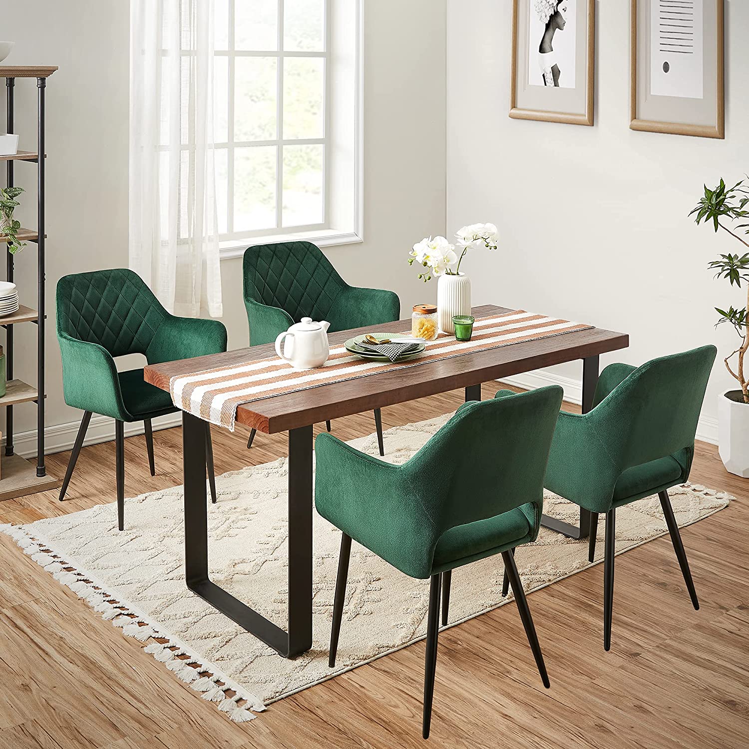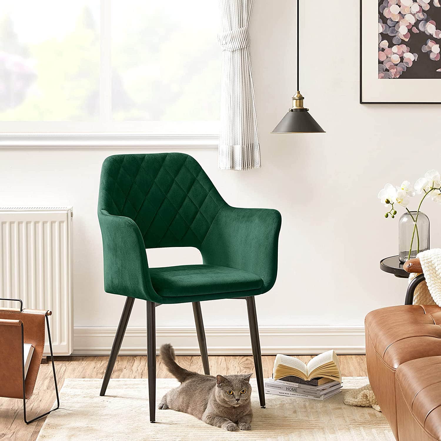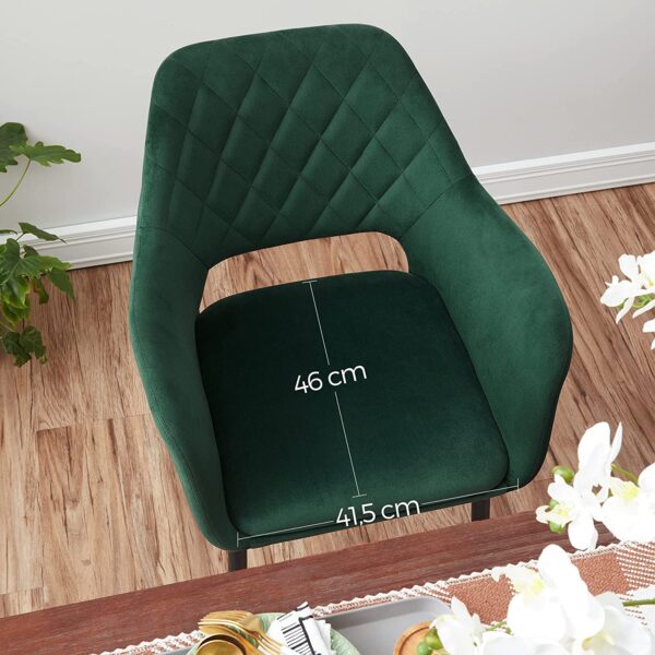 Išbandykite jaukumą: Ergonomiškas dizainas, storas putplasčio paminkštinimas, kokybiškas aksominis užvalkalas ir patvarios metalinės kojelės – šie elementai sukuria tvirtą ir patogią kėdę. Dar geriau, kad kėdė yra gražios išvaizdos, kuri įneša malonią atmosferą į bet kurį kambarį.