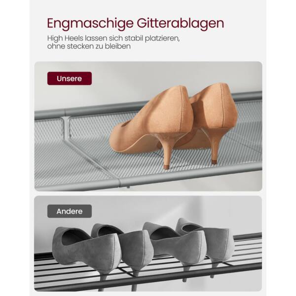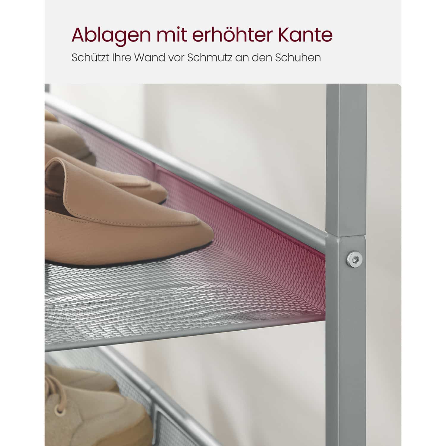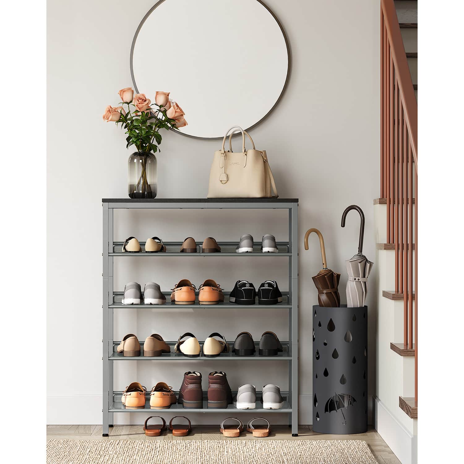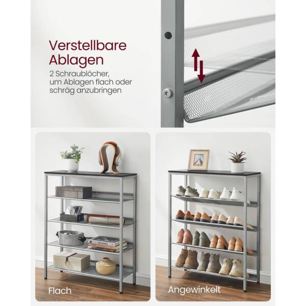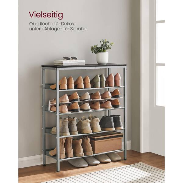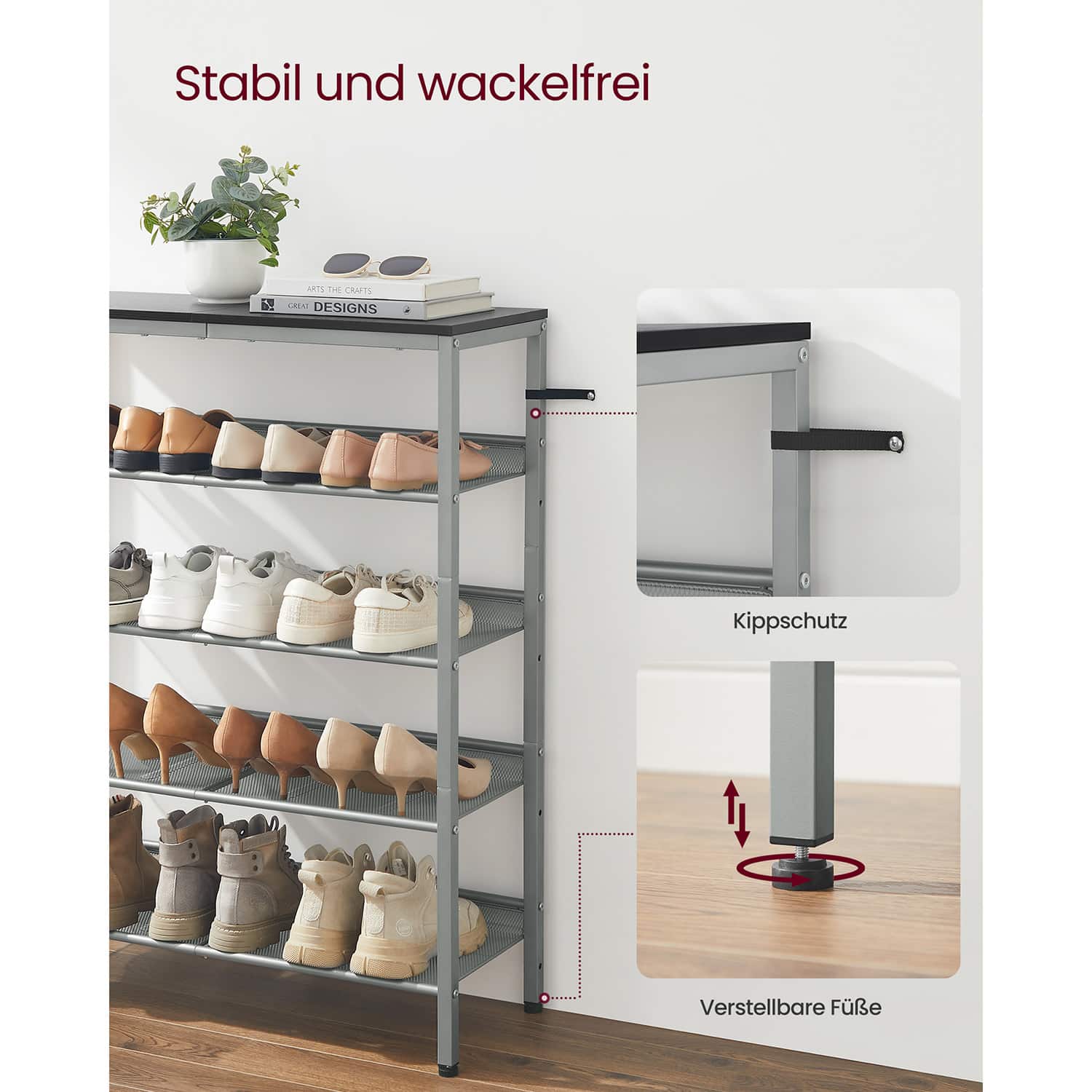 Ši 5 pakopų pramoninio stiliaus batų lentyna, pilkos spalvos, yra puikus sprendimas tvarkingai laikyti batus ir kitus daiktus. Jos modernus dizainas puikiai dera su įvairiais interjero stiliais.