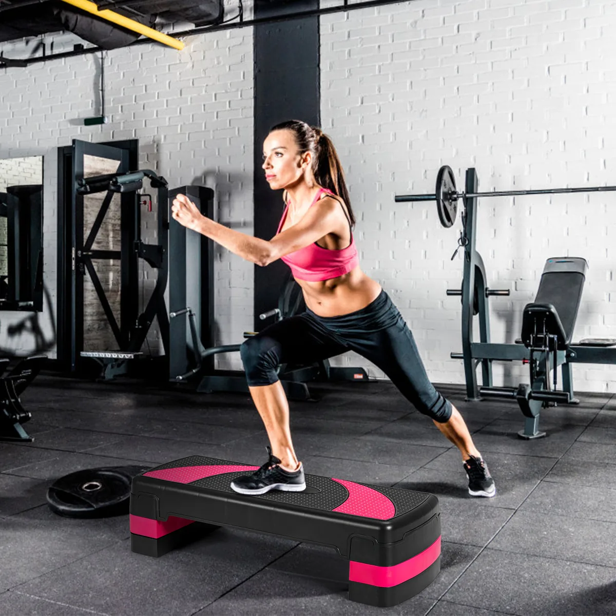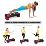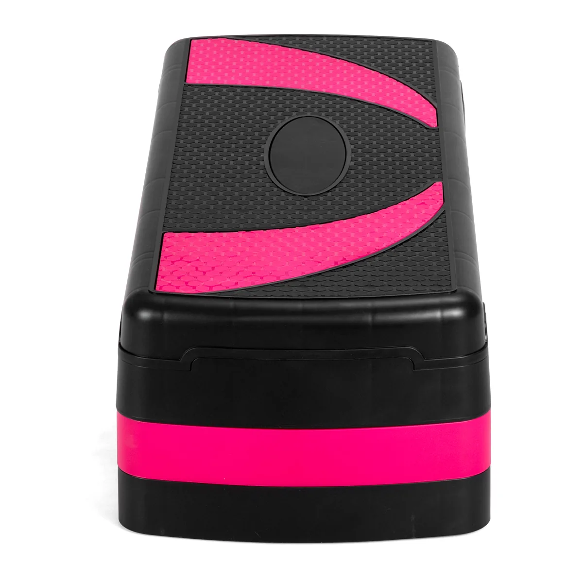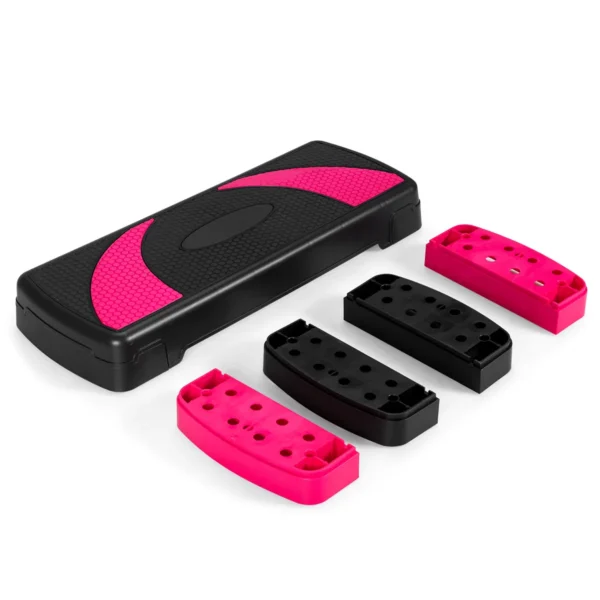 Aerobinis stepas 78,5x30x20 cm, juodos ir rožinės spalvos, skirtas efektyvioms treniruotėms namuose, biure ar sporto salėje. Šis steperis padeda stiprinti raumenis, gerinti ištvermę ir sudeginti kalorijas įvairaus amžiaus bei fizinio pasirengimo žmonėms.
