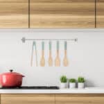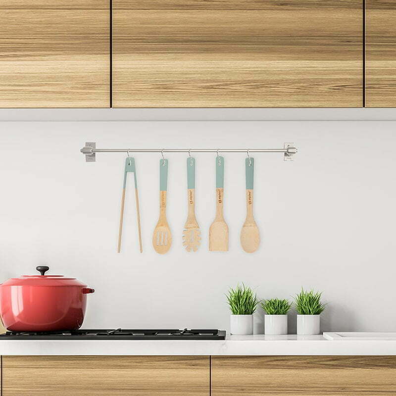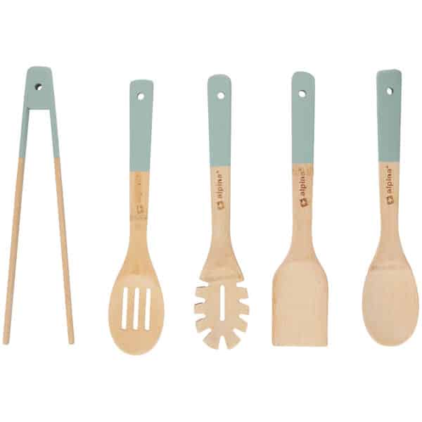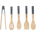 5 medinių virtuvės reikmenų rinkinys. Rinkinį sudaro: žnyplės, mentelė, maišymo šaukštas, košimo šaukštas, makaronų šaukštas.Indai tinka visų tipų indams. Jie nepraleidžia šilumos ir nebraižo tefloninių paviršių. Indų rankenoje yra skylutė, kad būtų galima juos pakabinti.Lengva valyti ir patogu laikyti.Produkto savybės:- Medžiaga: plastikas- Indų ilgis 30 cm- Komplekte:- maišymo šaukštas- šaukštas sietelis- makaronų šaukštas- žnyplės- mentele