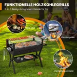 Anglies grilis 98x42x68 cm, juodos spalvos, skirtas maisto gamybai lauke. Šis kepsnys pasižymi funkcionaliu „trys viename“ dizainu, leidžiančiu naudoti kaip tradicinę anglies kepsninę, stovyklavimo viryklę ar laužo duobę. Patogi konstrukcija ir efektyvi ventiliacija užtikrina tolygų ir greitą kepimą.