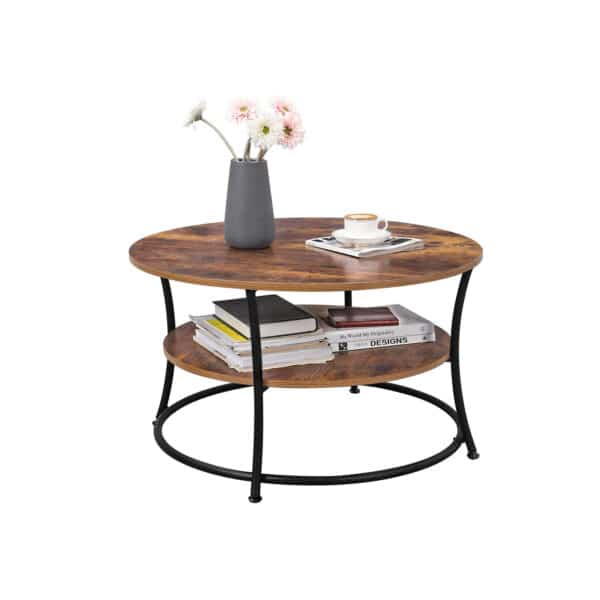 Šis apvalus kavos staliukas su metaliniu rėmu yra puikus pasirinkimas jūsų namų interjerui. Jo vintažinė tamsiai ruda spalva suteikia elegancijos ir šilumos bet kuriai patalpai.