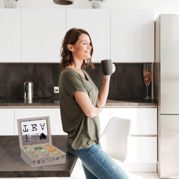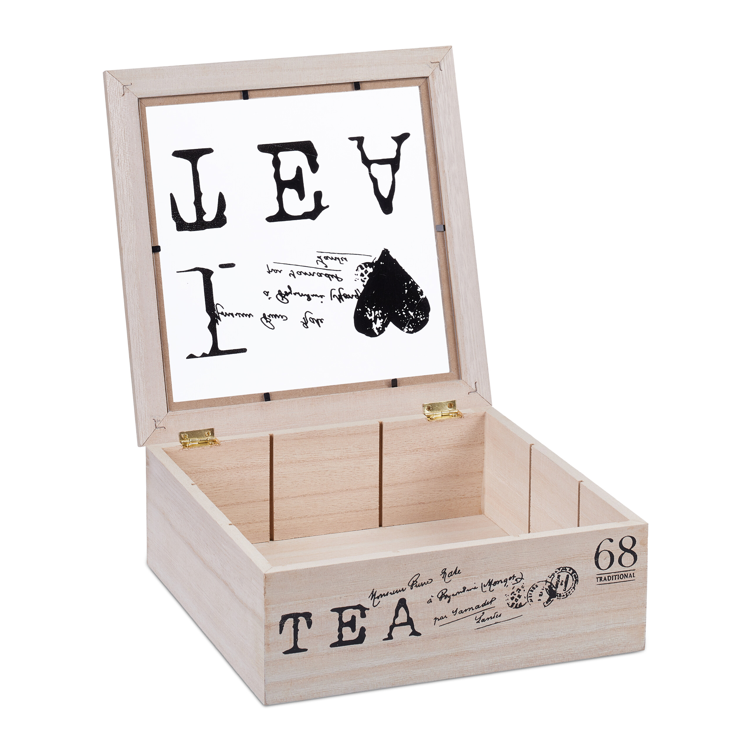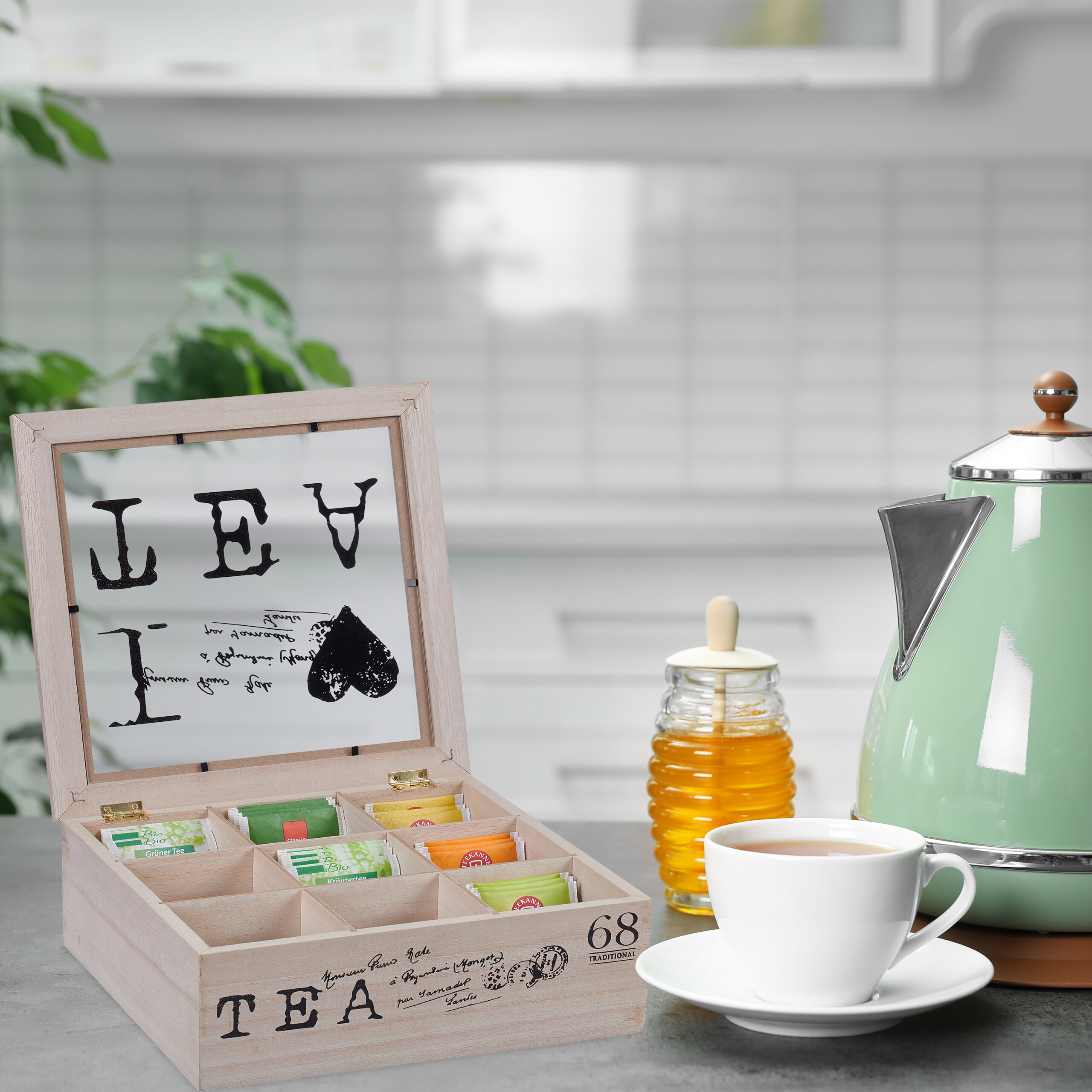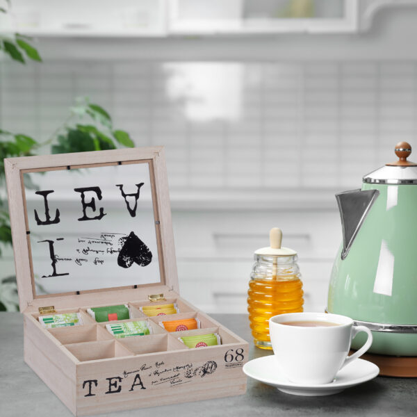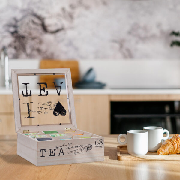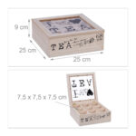 Šis arbatos maišelių organizatorius yra idealus sprendimas, jei norite laikyti skirtingų rūšių arbatą aiškiai ir apsaugotą nuo aromato. Visos Jūsų mėgstamos veislės gali būti laikomos 9 skyriuose, kurie visada bus paruošti po ranka. Arbatos indelis turi plastikinį langą su užrašu „I Love Tea“, suteikiantį papildomo žavesio.