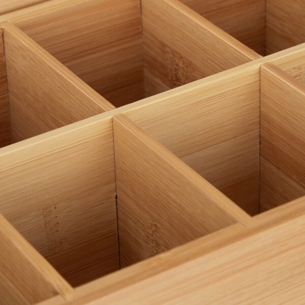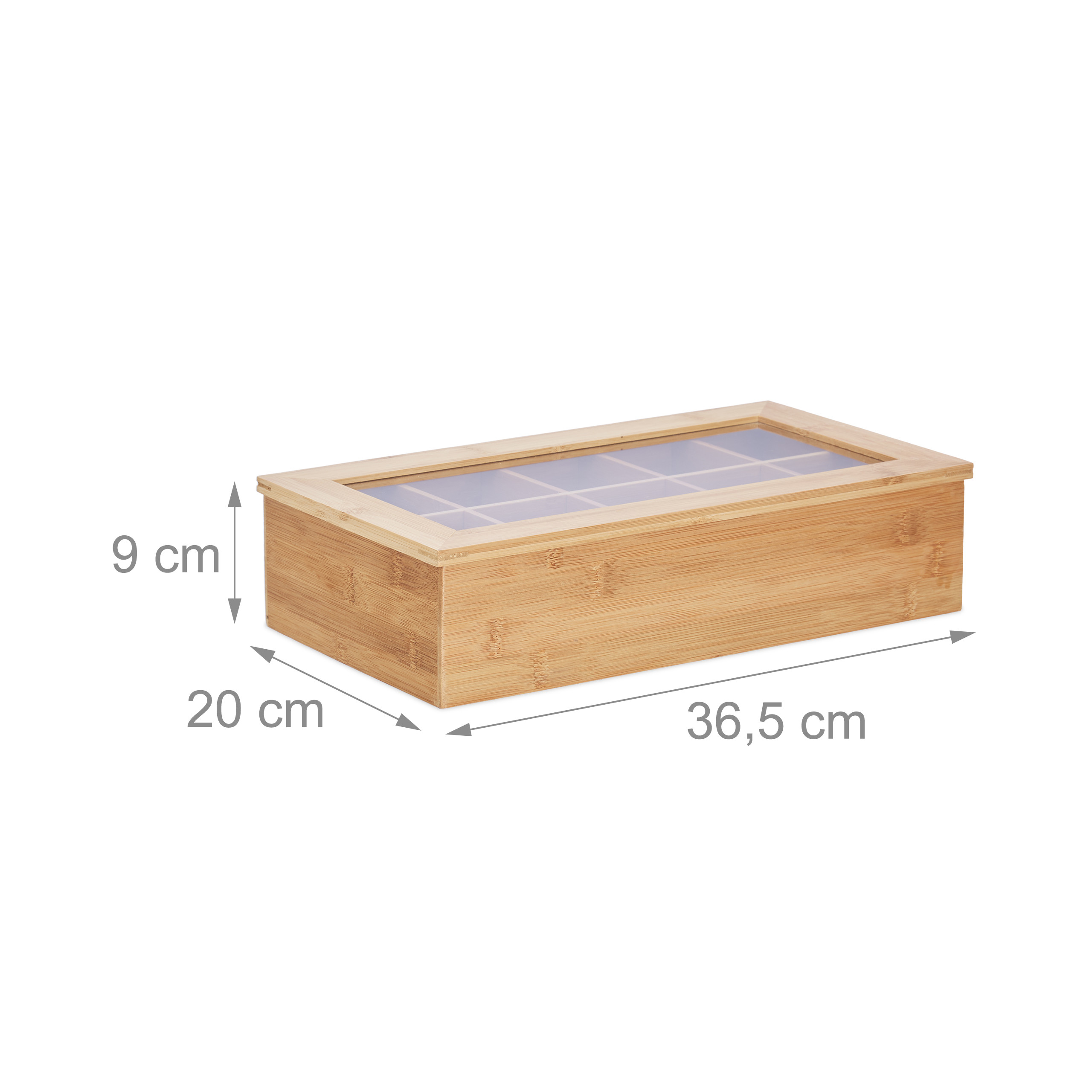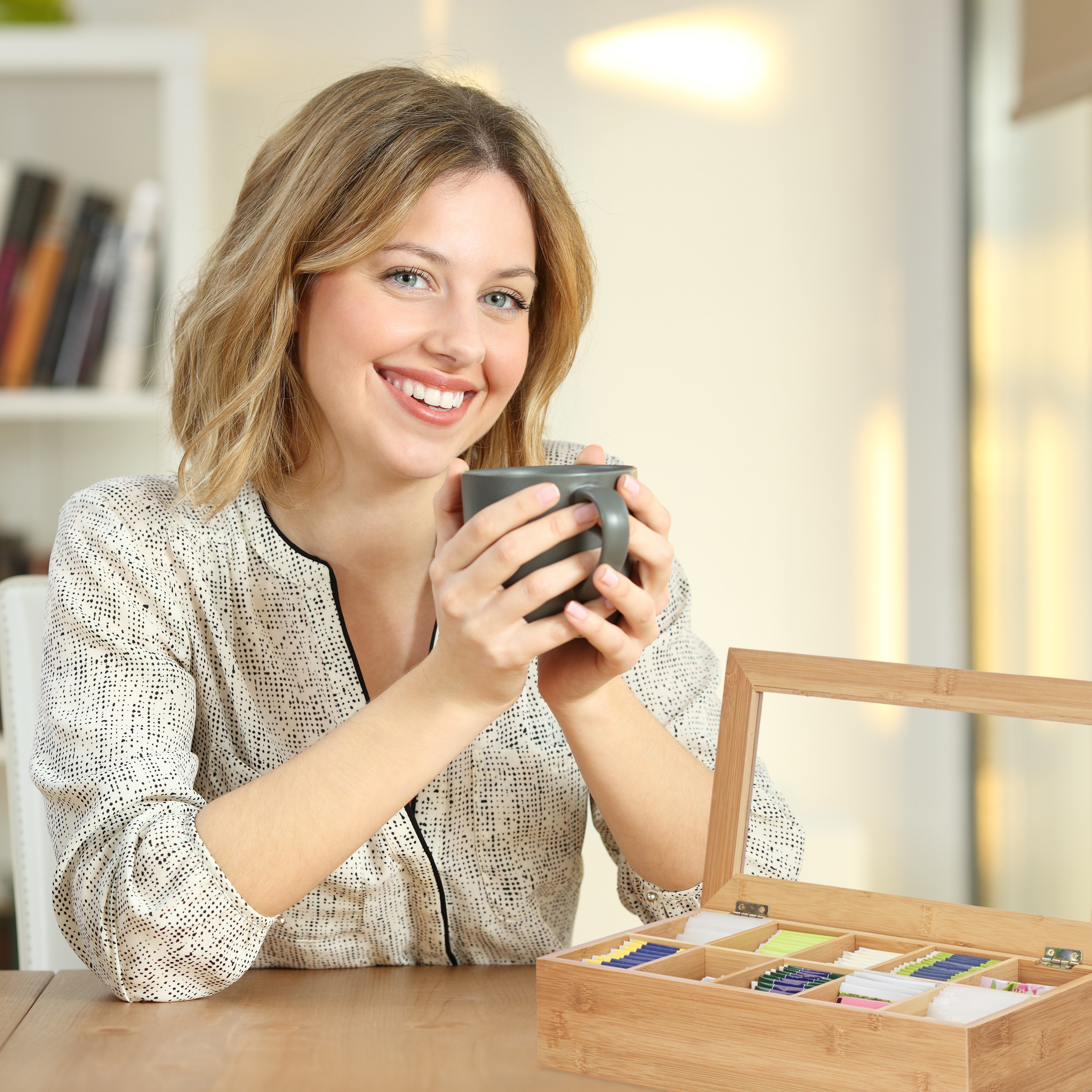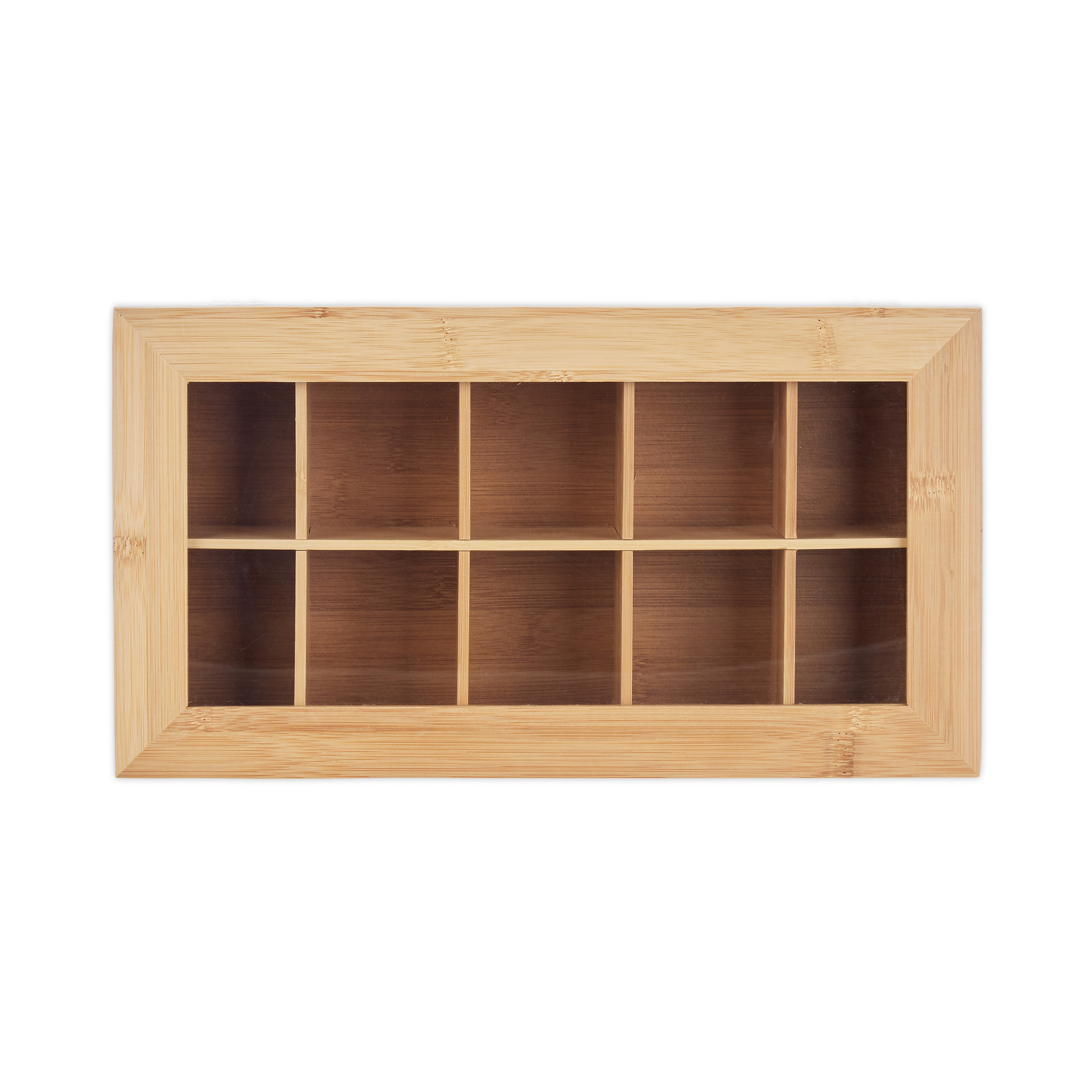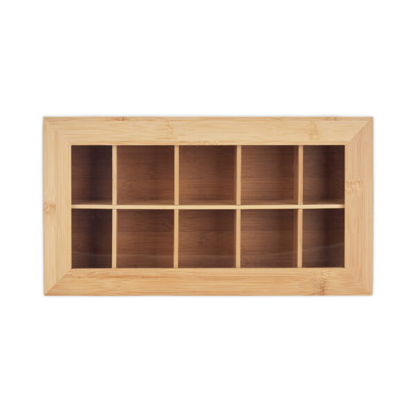 - 10 skyrių: Kiekvienas skyrius yra specialiai sukurtas, kad arbatos maišeliai būtų tvarkingai laikomi ir lengvai pasiekiami.