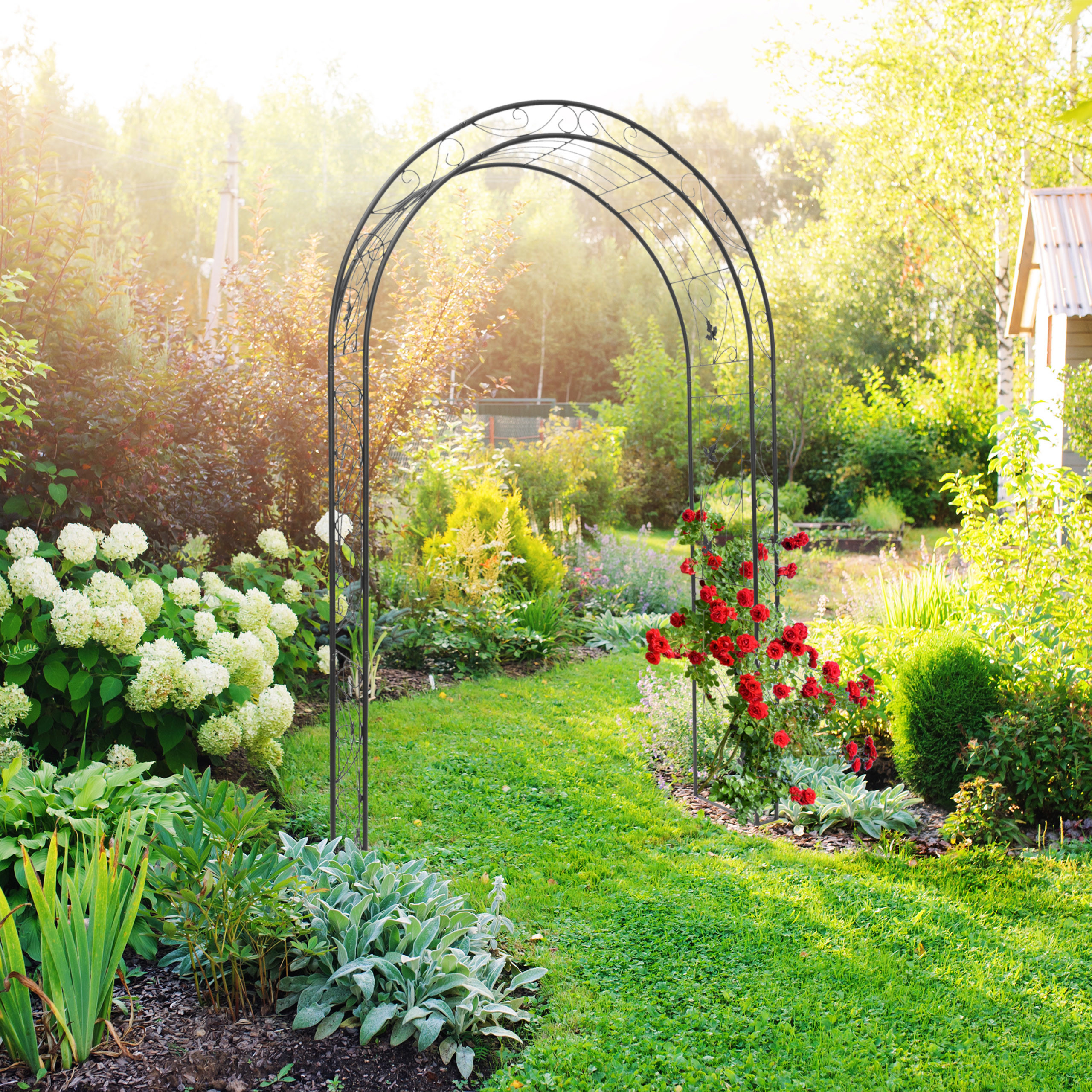 - Universalumas: Tinka visų rūšių vijokliniams augalams, tokiems kaip klematis ir vijoklinės rožės, kurie gali patogiai įsikibti į lenktus papuošalus.