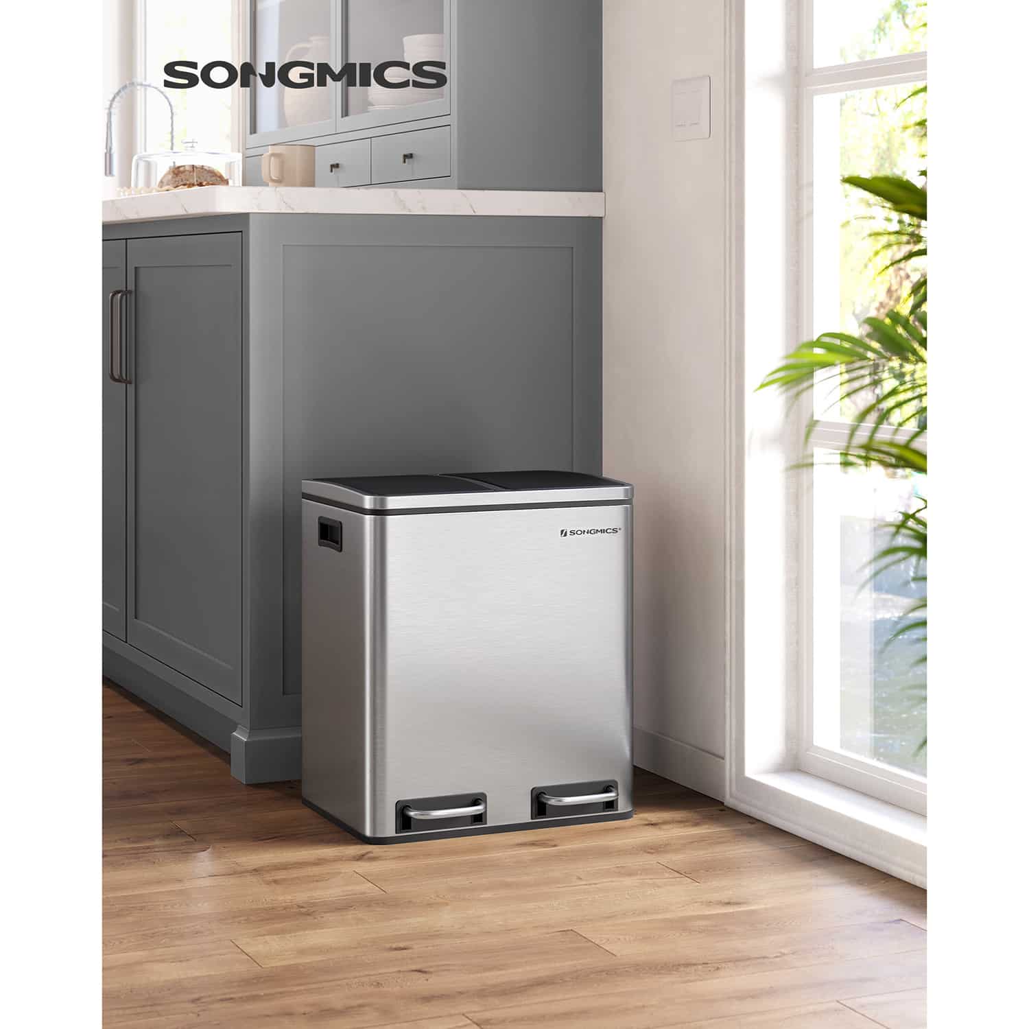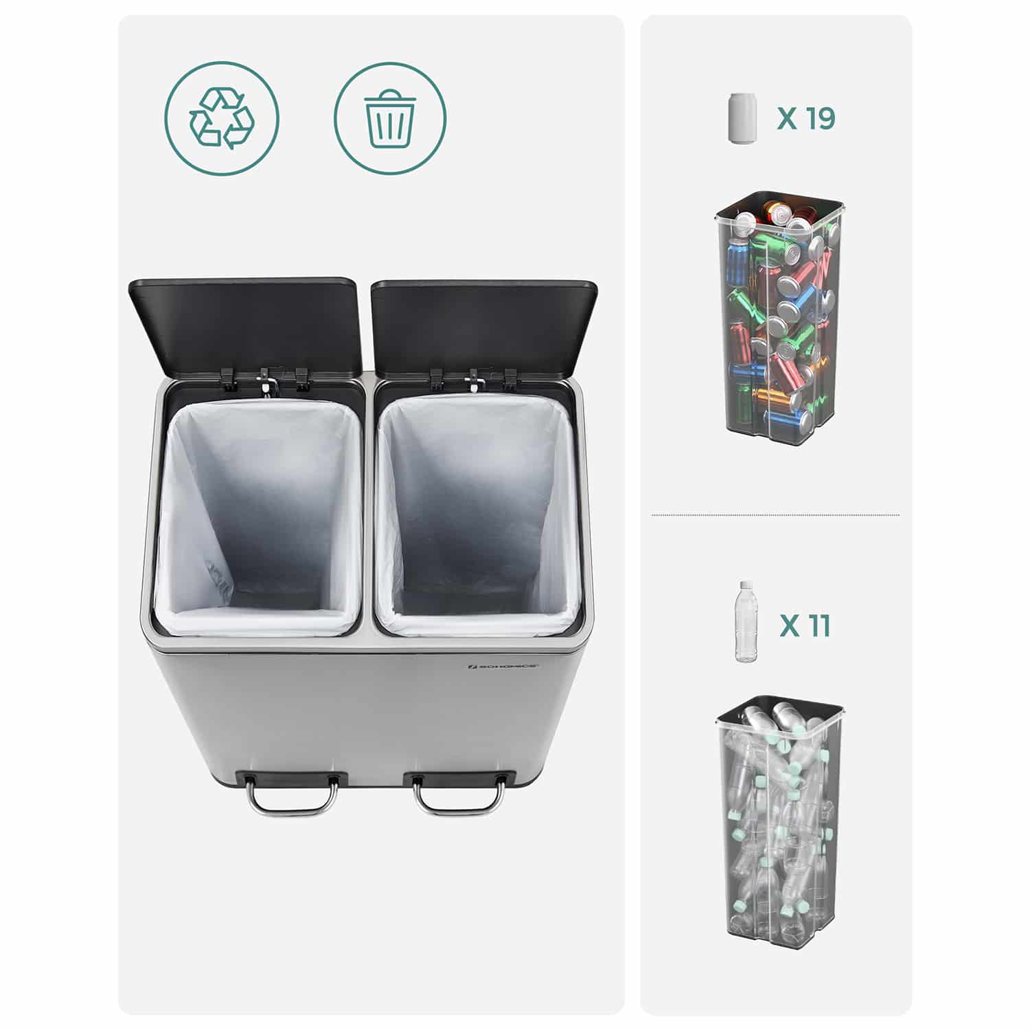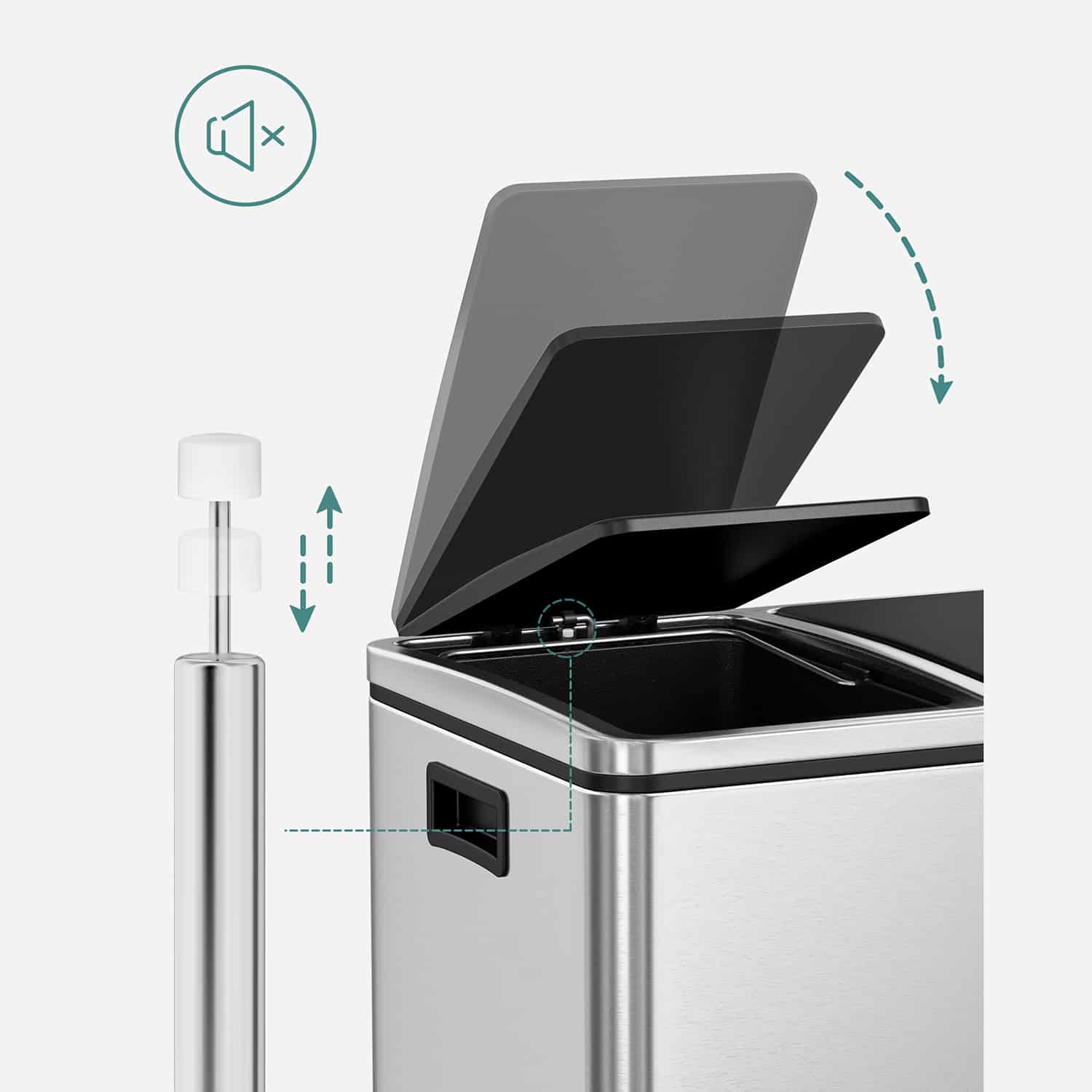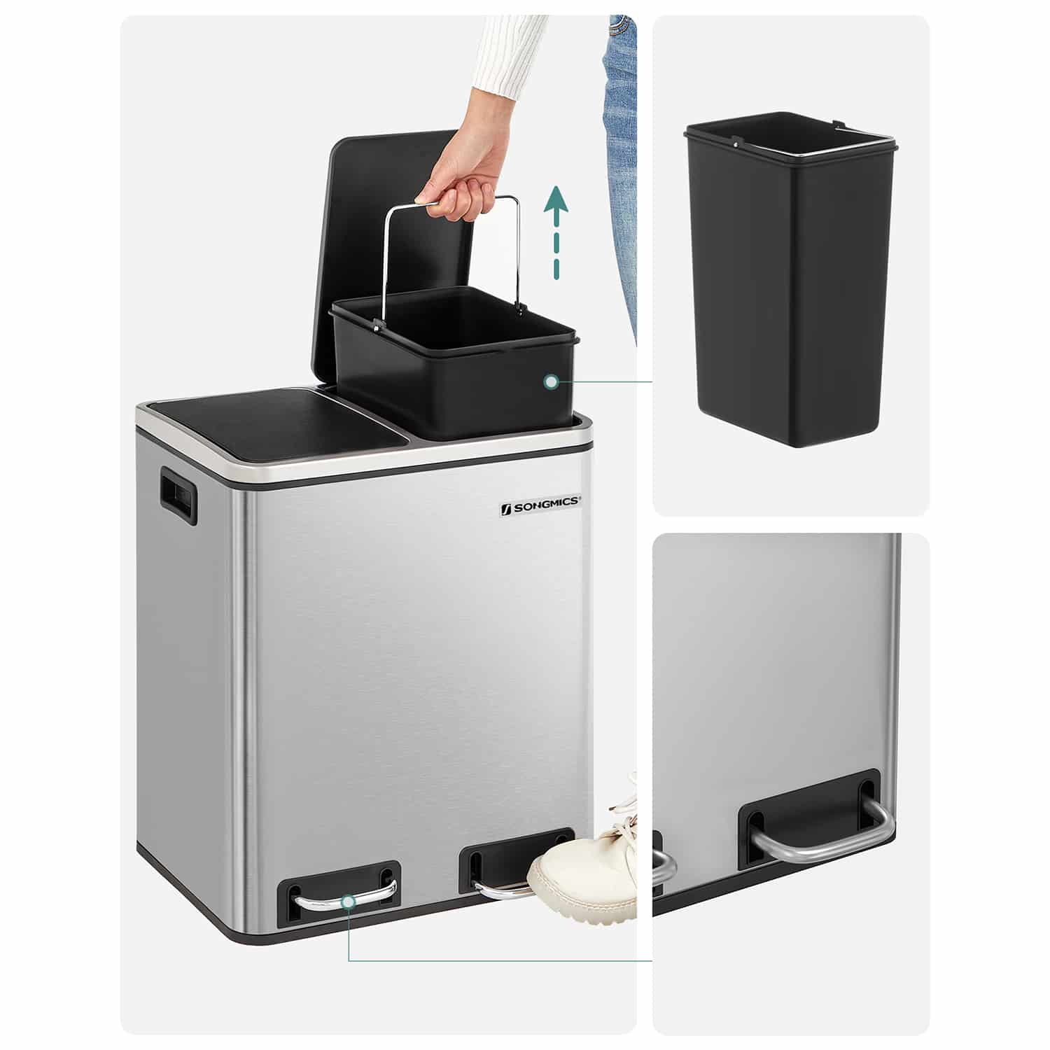 Tvirtas ir patvarus nerūdijančio plieno korpusas (storis 0,35 mm) padidina atsparumą slėgiui. Lengvai valomas korpusas yra atsparus korozijai. Dviejų rankenų įdėklų dėka galite lengvai perkelti šiukšliadėžę. Pagamintas iš ekologiško plastiko, dangtis gali sandariai uždaryti šiukšliadėžę. Dėl ergonomiškos dangčio konstrukcijos, šiukšliadėžė lengvai atidaroma ir uždaroma su nedideliu triukšmu. Vidines šiukšliadėžes galima išimti, todėl labai patogu pervežti šiukšles ir ištuštinti konteinerius. Kojų pedalai yra stabilūs ir patvarūs. Neslystantis ir vandeniui atsparus pėdų stovas apsaugo jūsų grindis nuo įbrėžimų.