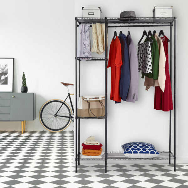 • Universalumas: Atvira spintos sistema leidžia lengvai organizuoti ir pasiekti jūsų drabužius bei aksesuarus.