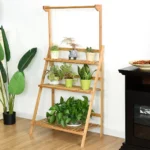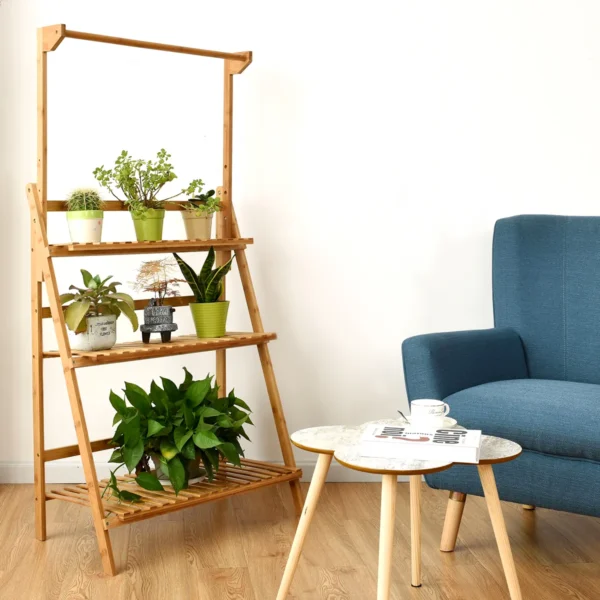 Augalų lentyna 70x40x144 cm, šviesiai rudos spalvos, skirta efektyviam augalų išdėstymui tiek patalpose, tiek lauke. Pakabinamas augalų stovas su reguliuojamu strypu ir trimis lygiais leidžia tvarkingai išdėstyti įvairaus dydžio augalus bei kitus daiktus. Pagaminta iš bambuko, lentyna yra patvari ir pritaikyta kasdieniam naudojimui.