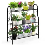 - 3 pakopų metalinė augalų lentyna su tankiu tinklo paviršiumi, leidžiančiu vandeniui nesikaupti.