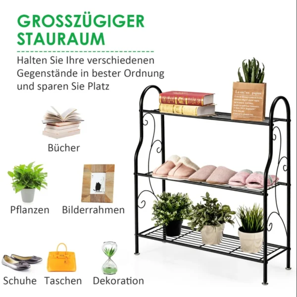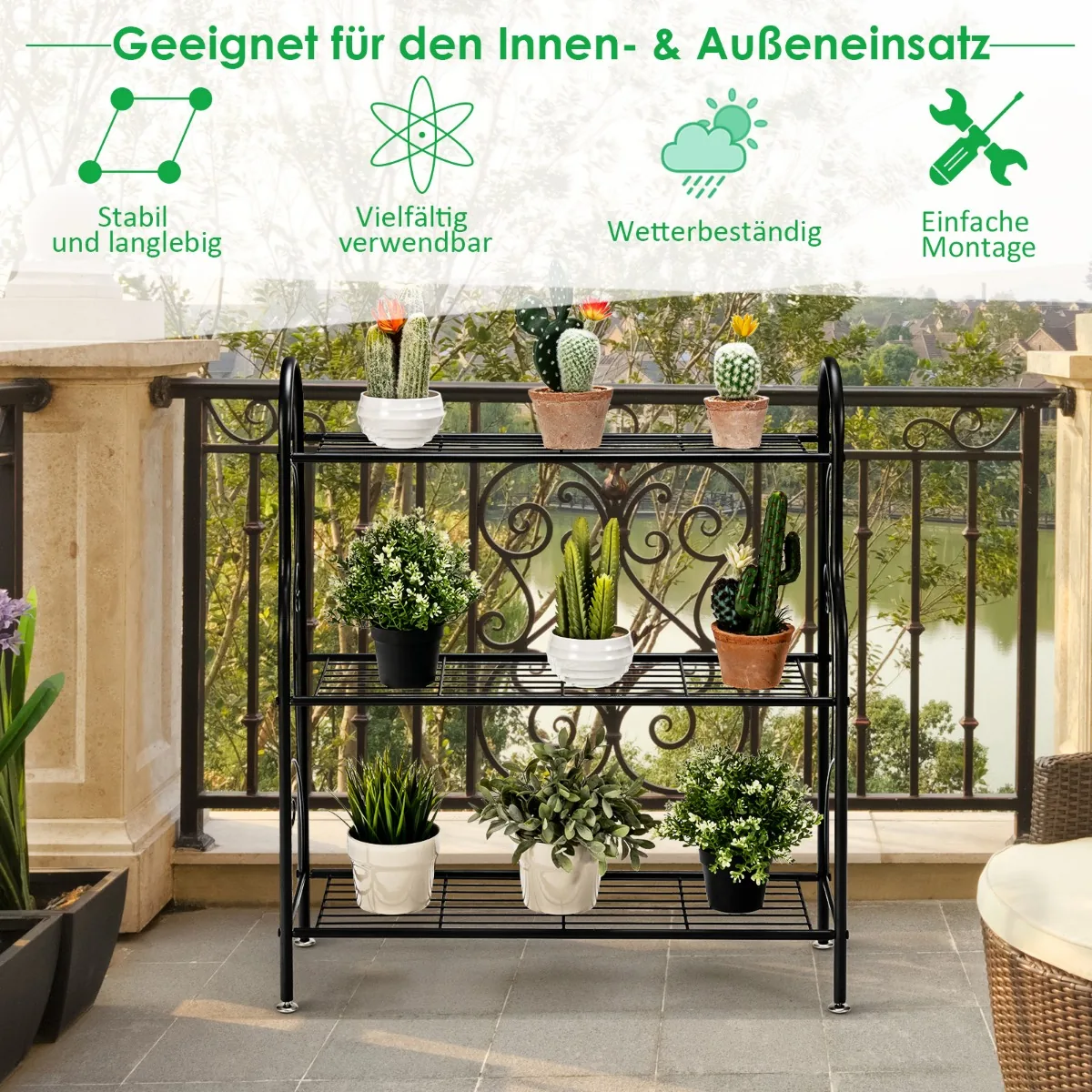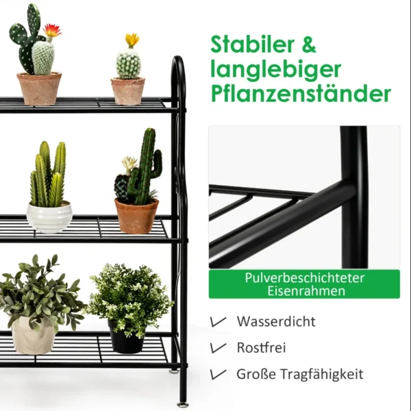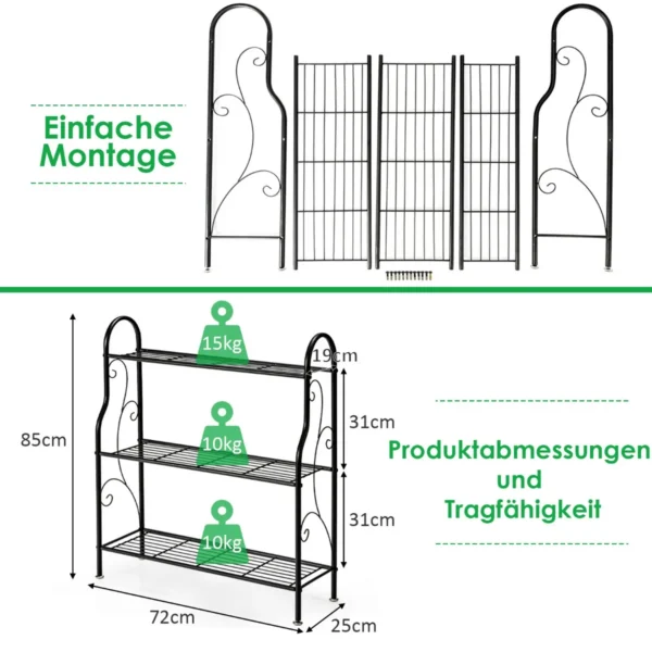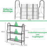 Augalų lentyna 72x25x85cm juodos spalvos yra praktiškas sprendimas augalų ir kitų daiktų laikymui viduje ar lauke. Metalinė konstrukcija užtikrina stabilumą ir atsparumą įvairioms oro sąlygoms, o trijų pakopų dizainas suteikia pakankamai erdvės skirtingų dydžių vazonams ir priedams.