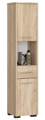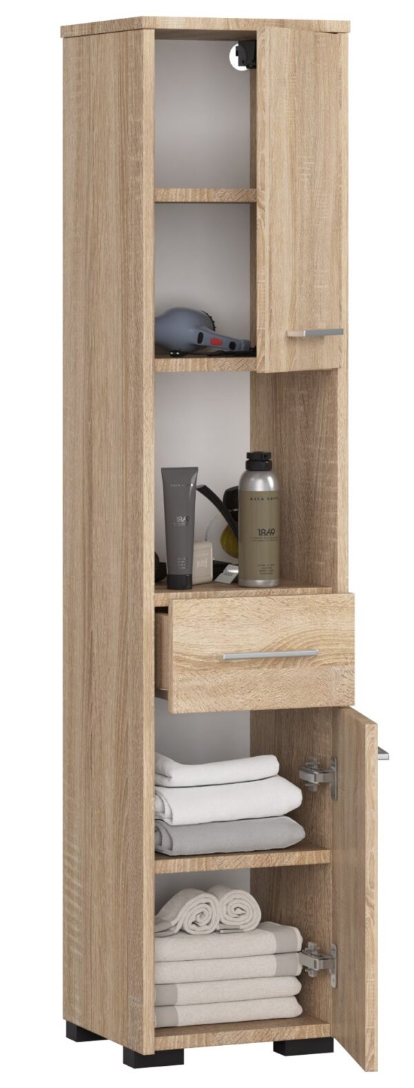 – Spintelė pagaminta iš aukštos kokybės 16 mm Kronospan laminuotos plokštės. Lenta yra 16 mm storio – Kiekvienoje durelių viduje yra po vieną lentyną – Tinkamai apsaugai skirti kraštai padengti ABS briauna – Spalvotos durys rankenos sidabrinės – Savarankiškai surenkama spintelė – Universali spintelė, pakuotėje yra reguliuojamos pakabos pakabinimui ir kojelės spintelei pastatyti ant grindų – Pristatymo instrukcijos – 24 mėnesių garantija Kas būdinga mūsų FIN 2D vonios stulpui? Visų pirma, unikalus modernus dizainas. Jis puikiai dera prie šiuolaikinio vonios kambario išvaizdos ir, pakeitimui, nėra, baltos spalvos. Dėl to dažniausiai šaltas kambarys įgauna šiek tiek šilumos. Pagaminta iš plokštės, atsparios ne tik braižymui ir trinčiai, bet ir drėgmei, dėl kurios pažeidžiama dauguma įprastų spintelių, šis stulpas yra viena geriausių investicijų. 140 cm aukščio leidžia paslėpti reikalingus daiktus ir suteikia papildomos vietos po ranka pasidėti tuos, kuriuos dažniausiai naudojate. 30 cm stulpelio gylis ir ilgis neužima daug vietos ir ypač praverčia mažose patalpose, o dvi atskirai uždaromos lentynos talpina didelį kiekį daiktų, įskaitant rankšluosčius. Papildomas stalčius leidžia paslėpti smulkius daiktus iš matymo lauko. Vonios kambario Ąžuolo spalva dedama ant elegantiškų stulpų, kurie užtikrina jo stabilumą.