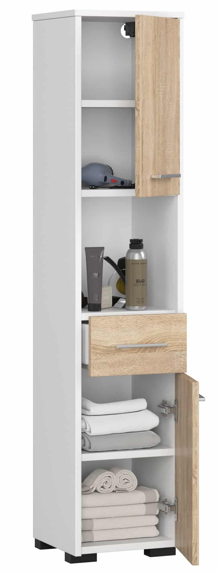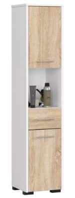 Aukšta vonios spintelė Zaven Fin yra elegantiškas ir funkcionalus baldas, kuriame galima laikyti rankšluosčius, kosmetiką ir kitus vonios reikmenis. Jį sudaro lentyna, stalčius ir dvi spintelės, todėl atsiranda daug laisvos erdvės plėtrai. Baldai balti, tačiau spintelių fasadai yra sonomos spalvos, kuri suteikia įdomų vizualinį efektą. Durų rankenos sidabrinės. Postas – modernus ir stilingas baldas, padėsiantis vonios kambaryje palaikyti tvarką. Jį pagamino iš aukštos kokybės laminuotos plokštės (16 mm) įmonė Krospan, o jos kraštai yra faneruoti ABS apvadu. Asortimente yra vonios lentynos daug privalumų. Svarbiausi iš jų: atsparumas ir ilgaamžiškumas, moderni išvaizda ir tvirtumas, talpa, funkcionalumas, įdomios spalvos – baltos ir sonomos ąžuolo derinys, lengvas surinkimas, universalumas – į paketą įeina reguliuojamos pakabos ir kojelės, leidžiančios pastatyti spintelę ant žemės, patraukli kaina, garantija 24 mėn.
