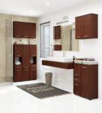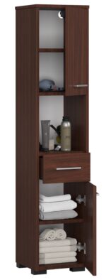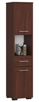 – Spintelė pagaminta iš aukštos kokybės 16 mm Kronospan laminuotos plokštės. Lenta yra 16 mm storio – Kiekvienoje durelių viduje yra po vieną lentyną – Tinkamai apsaugai skirti kraštai padengti ABS briauna – Spalvotos durys rankenos sidabrinės – Savarankiškai surenkama spintelė – Universali spintelė, pakuotėje yra reguliuojamos pakabos pakabinimui ir kojelės spintelei pastatyti ant grindų – Pristatymo instrukcijos – 24 mėnesių garantija Vonios lentynos stulpas yra puikus baldas, kuris padės užpildykite tuščią erdvę vonios kambaryje ir vienu metu paslėpkite visus daiktus, kuriems to reikia. Vietoj netvarkingų skalbimo mašinų, kriauklių ar veidrodinių lentynų siūlome estetišką knygų lentyną, kuri ne tik sutalpins didžiąją dalį kosmetikos lauke, bet ir atrodys gražiai. Be to, leidžia po ranka susidėti būtiniausius daiktus. Tiks ir šampūnams, ir losjonams, ir rankšluosčiams. Vonios lentynos yra pagamintos iš laminuotos plokštės, kuri pasižymi atsparumu dilimui. Be to, dėl nuolatinės drėgmės jis pagamintas iš medžiagų, kurios neleidžia deformuotis dėl sąlyčio su vandeniu. Knygų spinta susideda iš viršutinės uždaros lentynos, vidurinės dalies be užrakto, stalčiaus ir apatinės dalies. Kiekvienas rakinamas elementas turi rankenėlę, stilistiškai priderintą prie baldo priekinių spalvų. Vonios kambario knygų lentyna yra madinga, tamsiai ruda spalva.