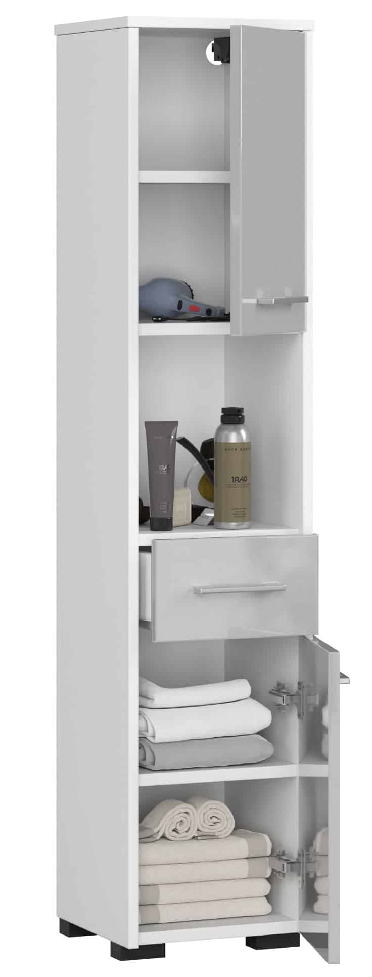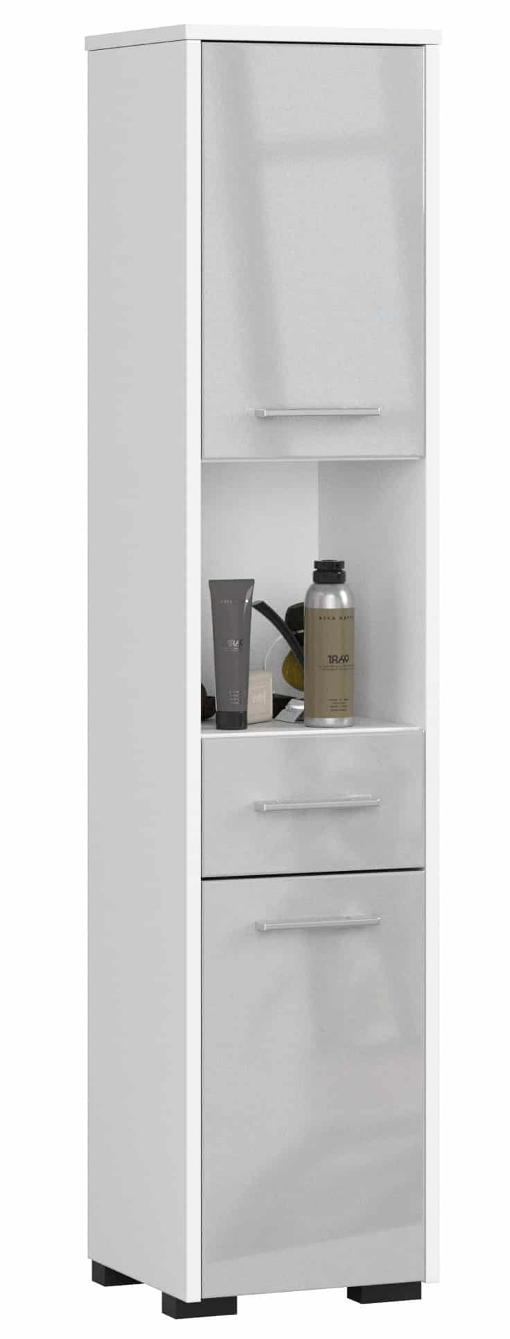 Šiuolaikinis vonios stulpelis FIN 2D yra puiki laikymo lentyna mažiems vonios kambariams. Jis veiks kaip priedas prie kitų vonios baldų arba kaip savarankiškas baldas. Jis pagamintas iš aukštos kokybės 16 mm pločio laminuotos plokštės Krosnopan, atsparios mechaniniams pažeidimams. Stulpas turi keturias stabilias, plačias kojeles, kurios suteikia jai lengvumo. Jų dėka taip pat lengvai išvalysite grindis po baldais, jų nejudindami. Stulpelyje yra dvi rakinamos spintelės su viena lentyna, stalčiukas ir niša virš jos, kuri leidžia būtiniausiai kosmetikai laikyti. Tiek spintelės, tiek stalčiai turi sidabrines rankenas, kurios puikiai susilieja su blizgiu baltu laminatu priekyje. FIN 2D vonios spintelė išsiskiria: minimalistinis dizainas, elegantiška apdaila, sidabrinės rankenos, kontrastingos keturios kojos Vonios spintelė FIN 2 skirta montuoti savarankiškai. Pakuotėje yra visi reikalingi komponentai ir išsami surinkimo instrukcija.