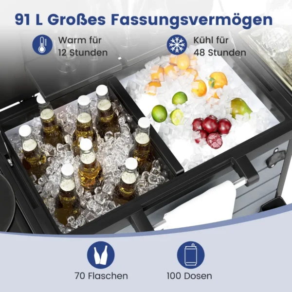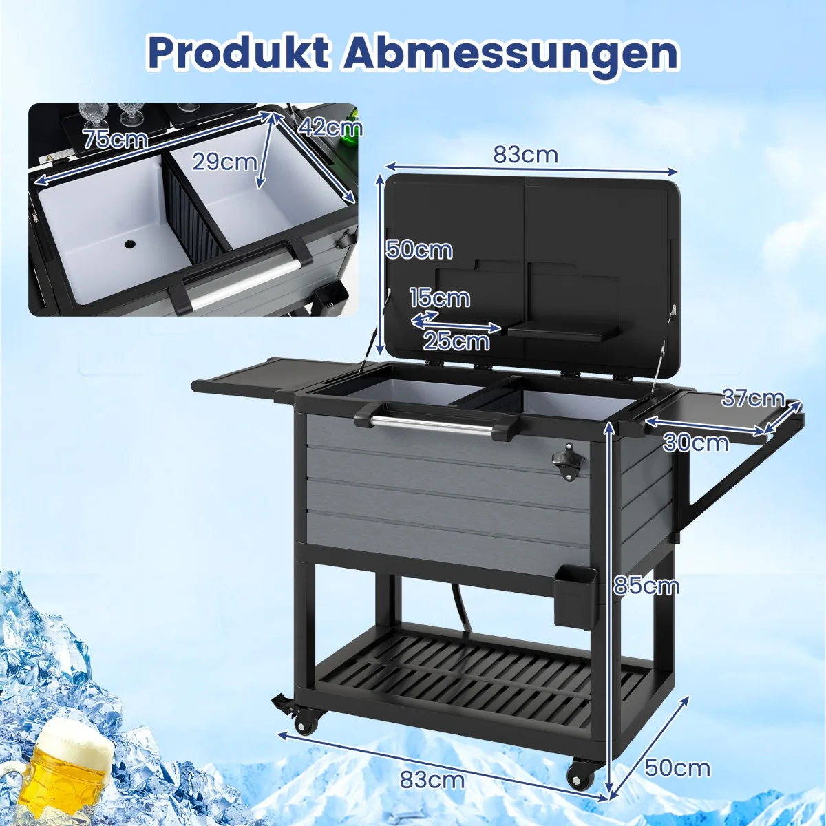 Aušinimo dėžė 83x50x85cm, pilkos spalvos, yra praktiškas sprendimas lauko renginiams ir pramogoms. Su 91 litrų talpa ir gera izoliacija ši dėžė efektyviai vėsina gėrimus iki 48 valandų bei leidžia patogiai laikyti įvairius maisto produktus. Dėl patogios konstrukcijos ir papildomų funkcijų ji tinka tiek vakarėliams, tiek kepsninių renginiams ar lauko susibūrimams.
