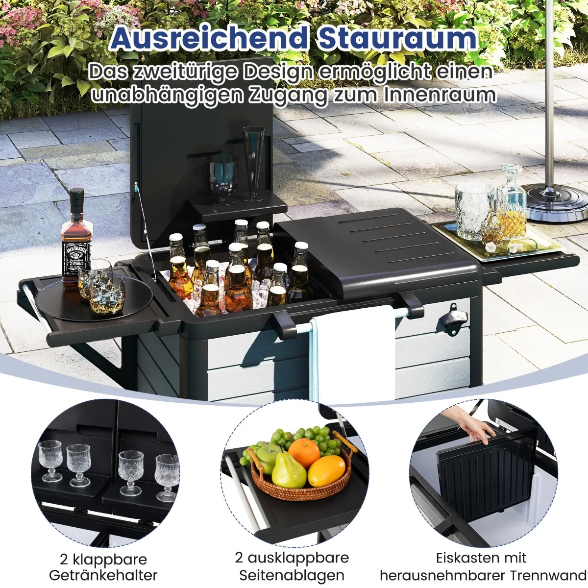 - Dėžėje yra du sulankstomi puodelių laikikliai, dvi sulankstomos šoninės lentynos ir įmontuotas butelių atidarytuvas su kamštelių gaudykle.