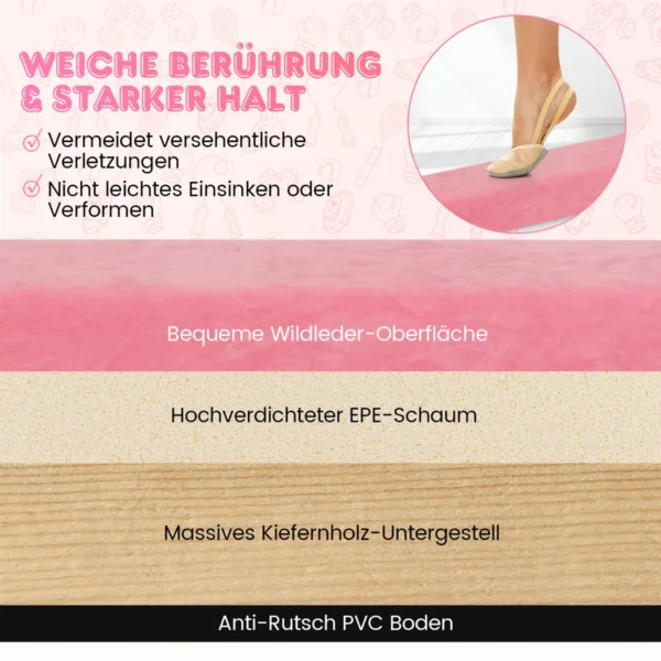 Balansinė sija 240x10x7,5 cm rožinės spalvos skirta vaikų gimnastikos pratimams tobulinti. Sulankstoma ir nešiojama, ji suteikia stabilų ir neslidų paviršių įvairaus lygio gimnastams. Tai patikima įranga balansui, raumenų jėgai ir koncentracijai ugdyti.