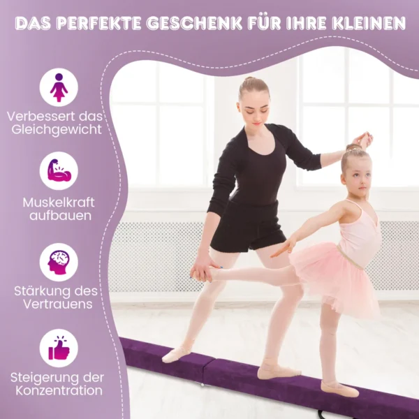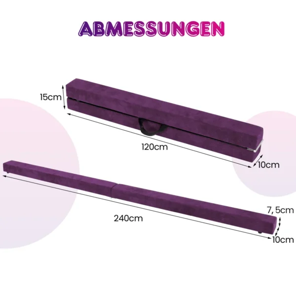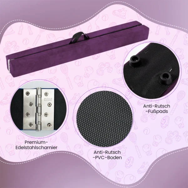 Balansinė sija 240x10x7,5 cm violetinės spalvos skirta vaikų gimnastikos pratimams ir pusiausvyros lavinimui. Sulankstomas dizainas ir neslystantis paviršius leidžia saugiai ir patogiai treniruotis tiek namuose, tiek treniruočių centruose.