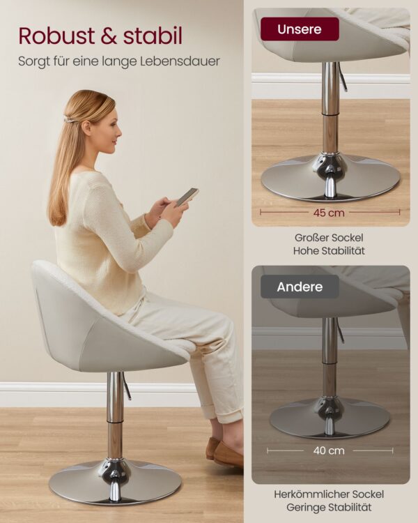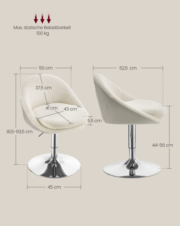 Pagrindo skersmuo yra 45 cm, o kėdės svoris – 6,8 kg. Maksimali statinė apkrova siekia 100 kg, todėl ši baro kėdė yra tvirta ir patikima.
