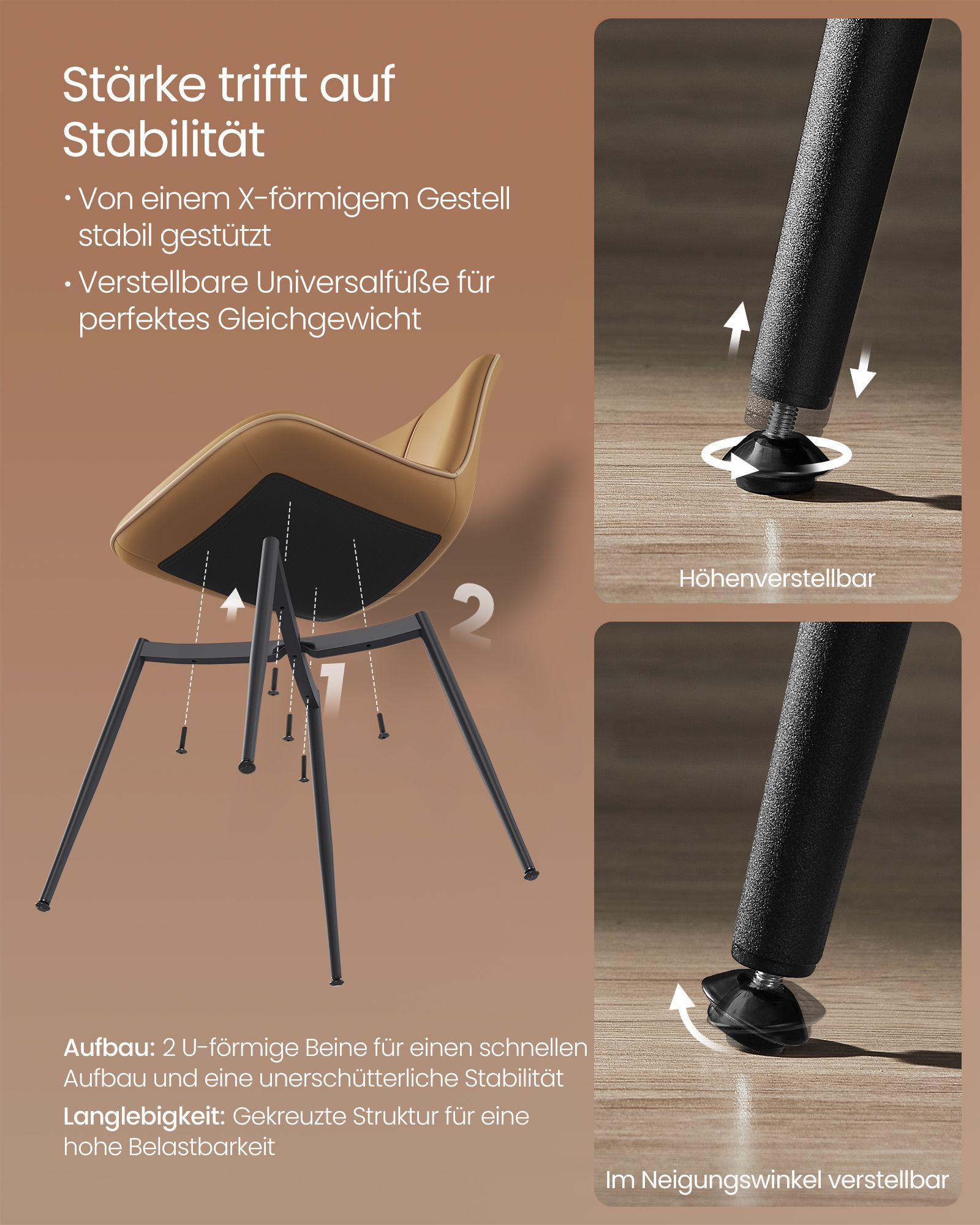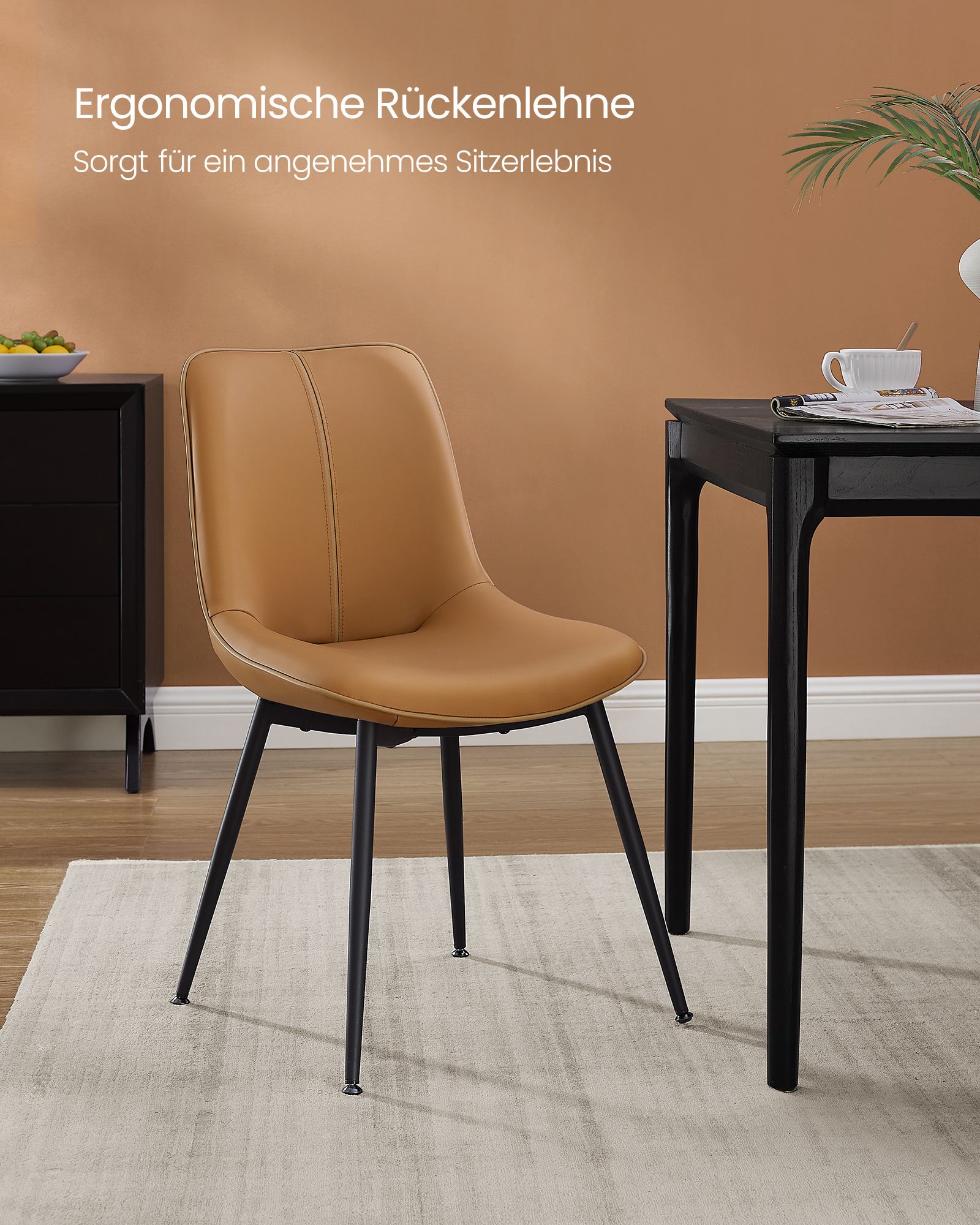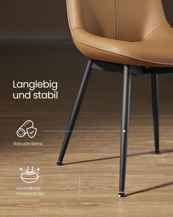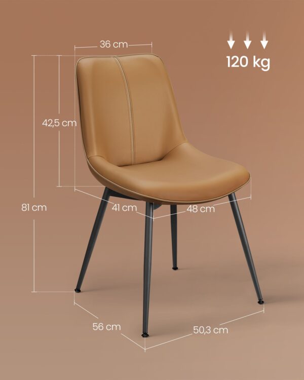 Pagaminta iš aukštos kokybės faneros, plieno, putplasčio ir PU, ši kėdė yra tvirta ir patvari. Sėdynės dydis yra 41 x 48 cm, o sėdynės aukštis – 38,5 cm, užtikrinantis patogų sėdėjimą. Atlošo aukštis siekia 42,5 cm.