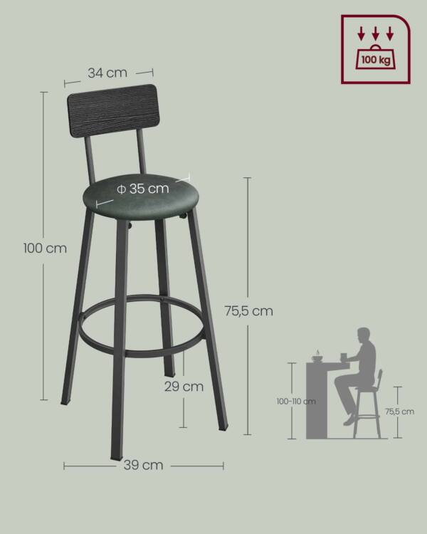 Kėdžių dydis yra 39 x 39 x 100 cm ), o sėdynės aukštis nuo grindų siekia 75,5 cm, todėl jos yra patogios ir ergonomiškos.