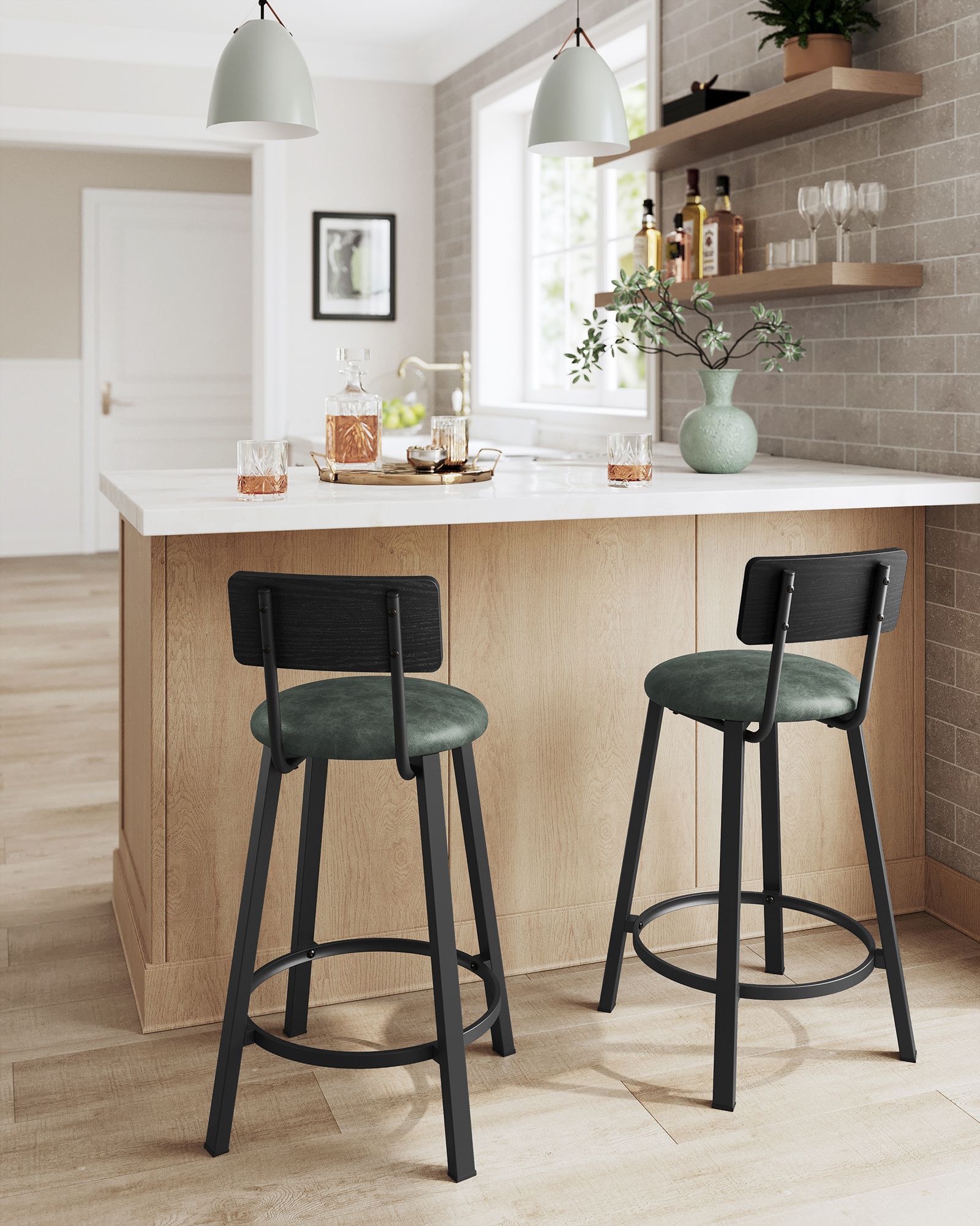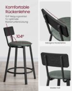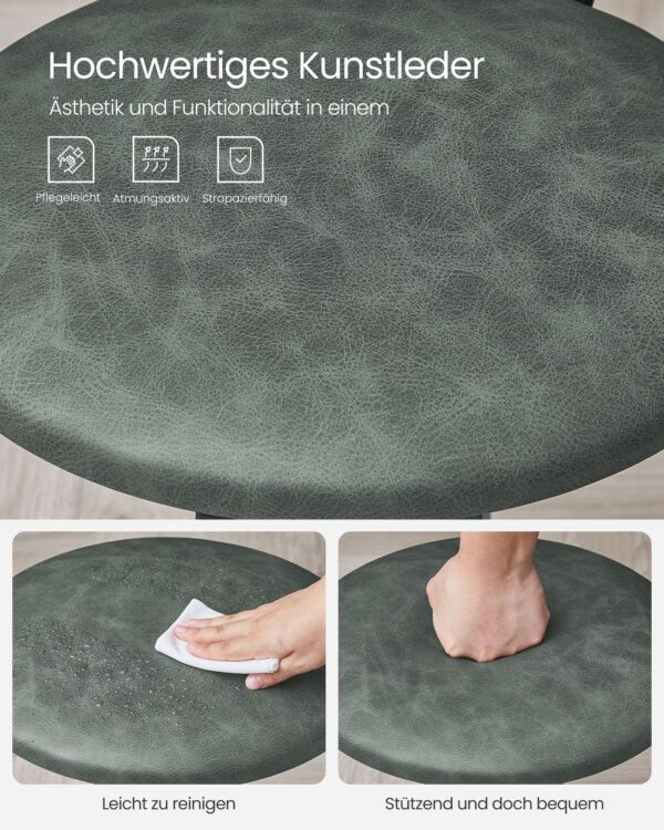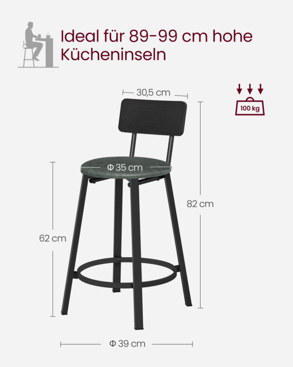 Pagamintas iš aukštos kokybės medžio drožlių plokštės, PU, putplasčio ir plieno, šis komplektas yra tvirtas ir ilgaamžis. Kėdžių matmenys yra 39 x 39 x 82 cm, o sėdynės aukštis nuo grindų siekia 62 cm.