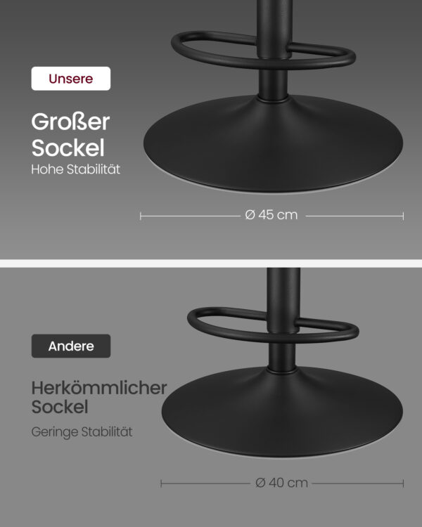 Kėdės pagamintos iš aukštos kokybės PU odos, chromuoto plieno ir putplasčio paminkštinimo, užtikrinančio komfortą ir ilgaamžiškumą. Kėdžių dydis yra 44 x 48 x (90-112) cm, o sėdynės aukštis reguliuojamas nuo 62 iki 84 cm.
