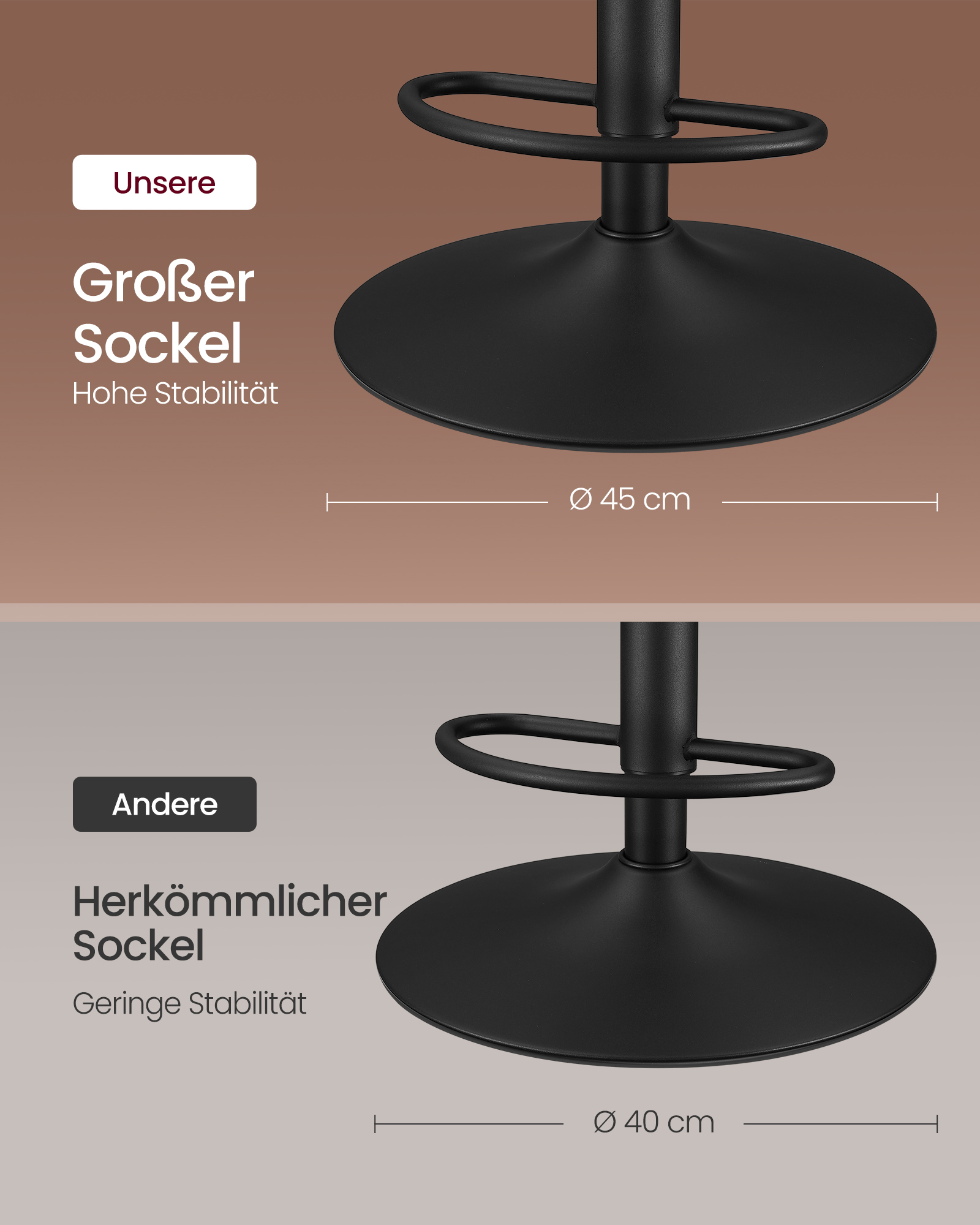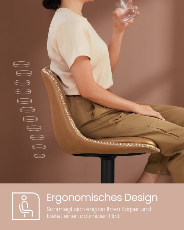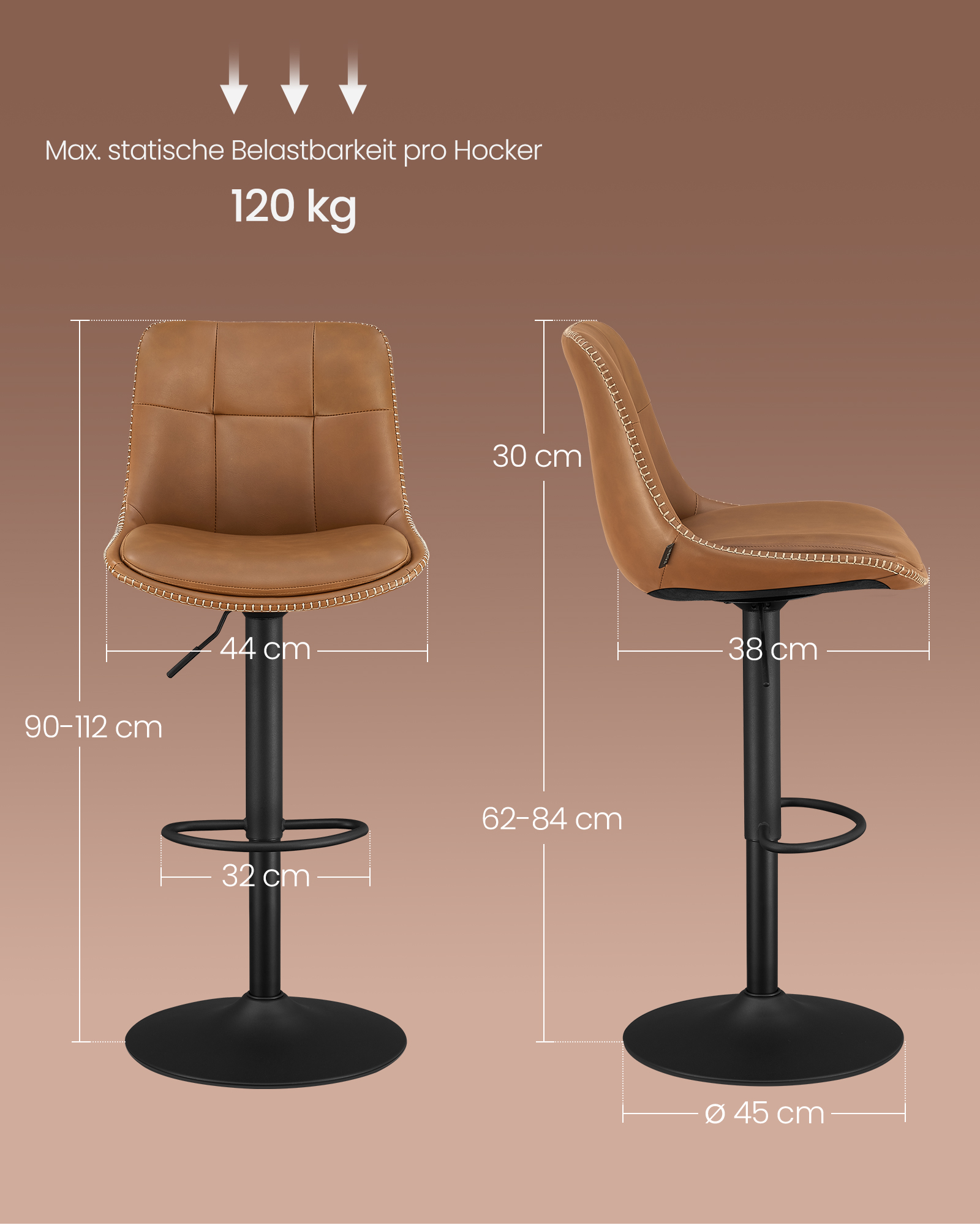 Pagamintos iš aukštos kokybės PU odos, chromuoto plieno ir putplasčio paminkštinimo, šios kėdės yra tvirtos ir patogios. Kėdžių matmenys yra 44 x 48 x (90-112) cm, o sėdynės aukštis reguliuojamas nuo 62 iki 84 cm.