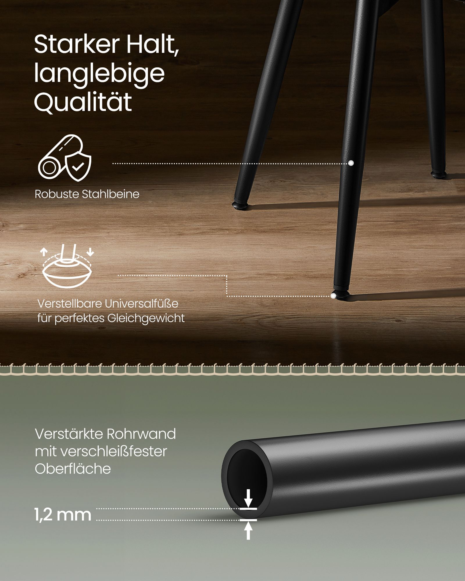 Kėdės pagamintos iš aukštos kokybės plieno, 58D putplasčio, PU sintetinės odos (poliuretano) ir faneros, užtikrinančios tvirtumą ir ilgaamžiškumą. Kiekvienos kėdės dydis yra 48 x 48 x 48,2 cm, o svoris – 2,5 kg.