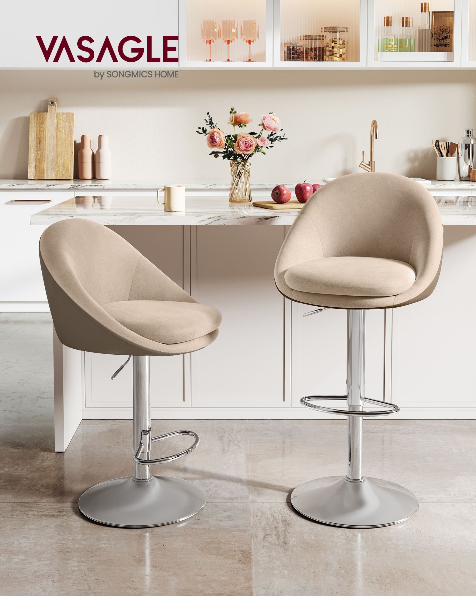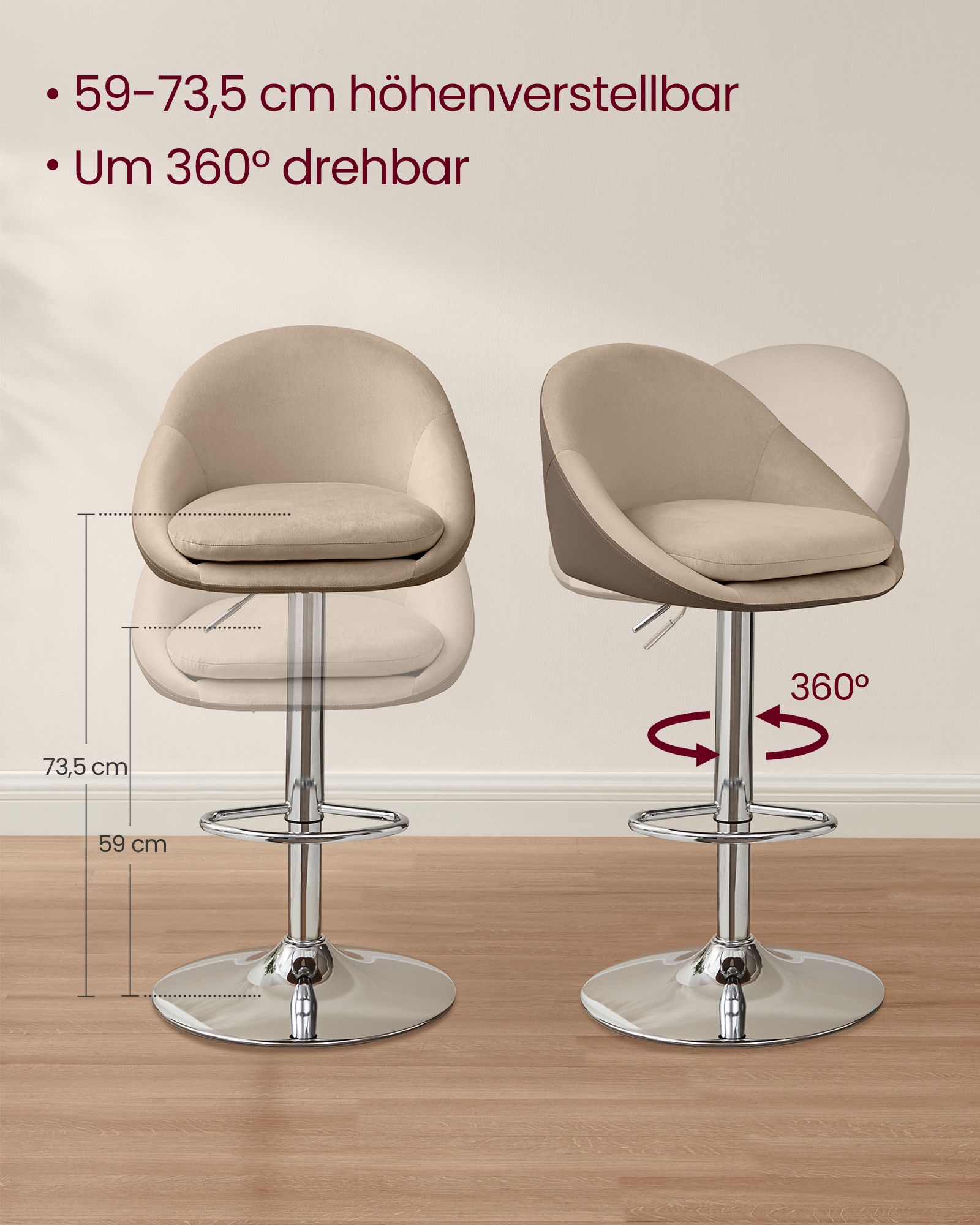 Kėdės pagamintos iš aukštos kokybės aksomo, PU odos ir metalo, užtikrinančių ilgaamžiškumą ir komfortą. Kėdės dydis yra 52,5 x 50 x (97,5-108,5) cm, o sėdynės aukštis reguliuojamas nuo 59 iki 73,5 cm, kad atitiktų jūsų poreikius.