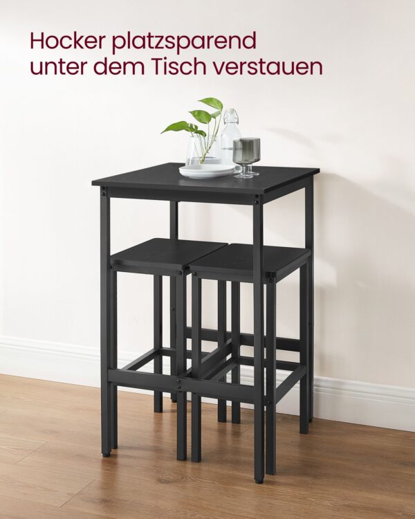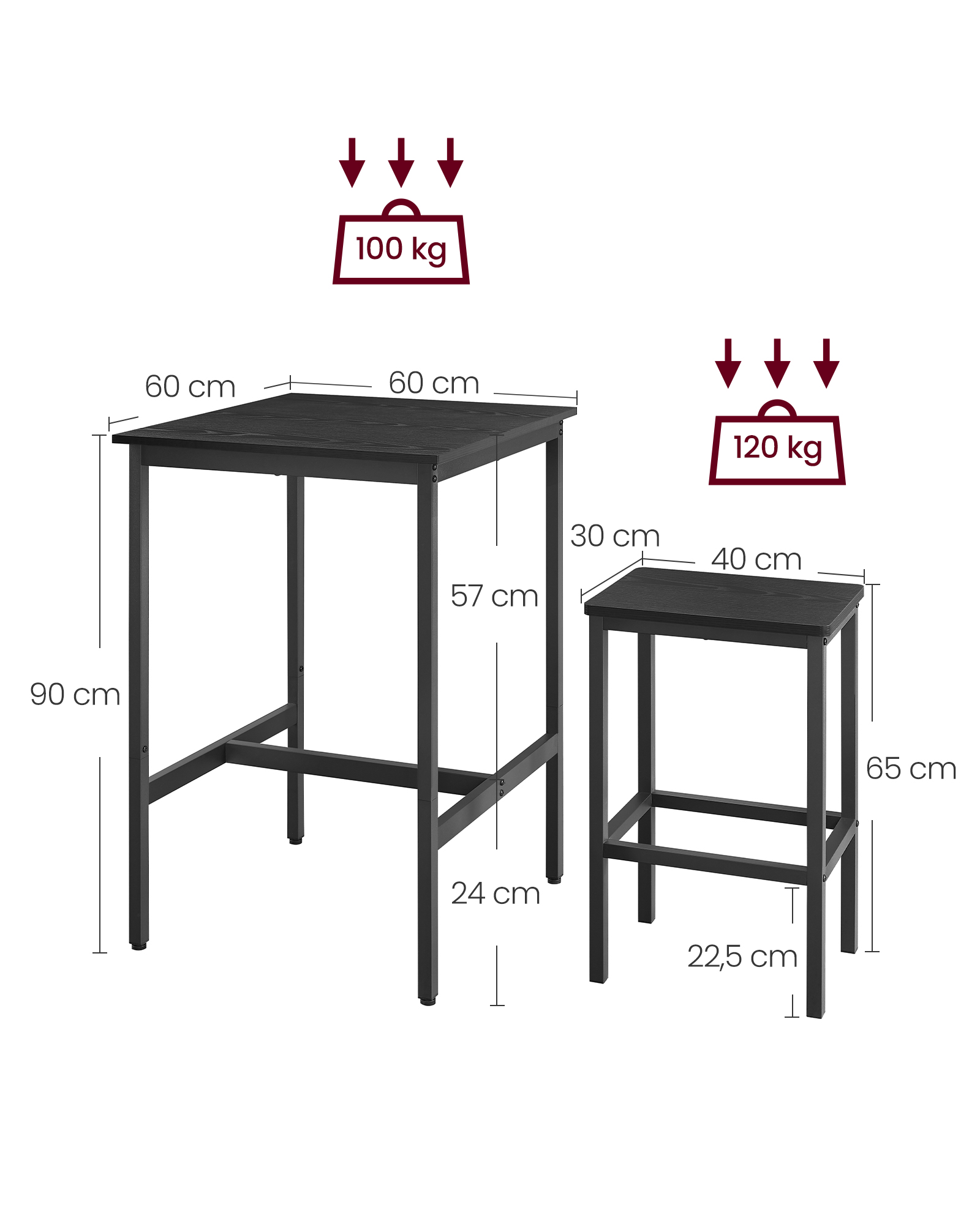 Pagamintas iš aukštos kokybės medžio drožlių plokštės ir plieno, šis komplektas yra tvirtas ir ilgaamžis. Stalo matmenys yra 60 x 60 x 90 cm, o taburetės – 30 x 40 x 65 cm. Bendras komplekto svoris siekia 19,1 kg.