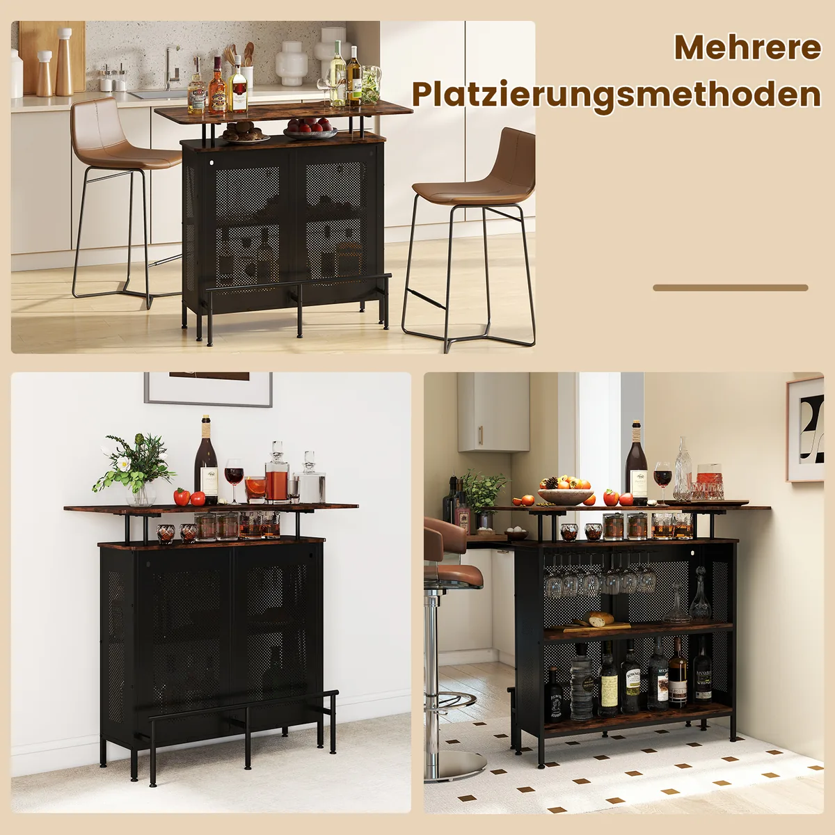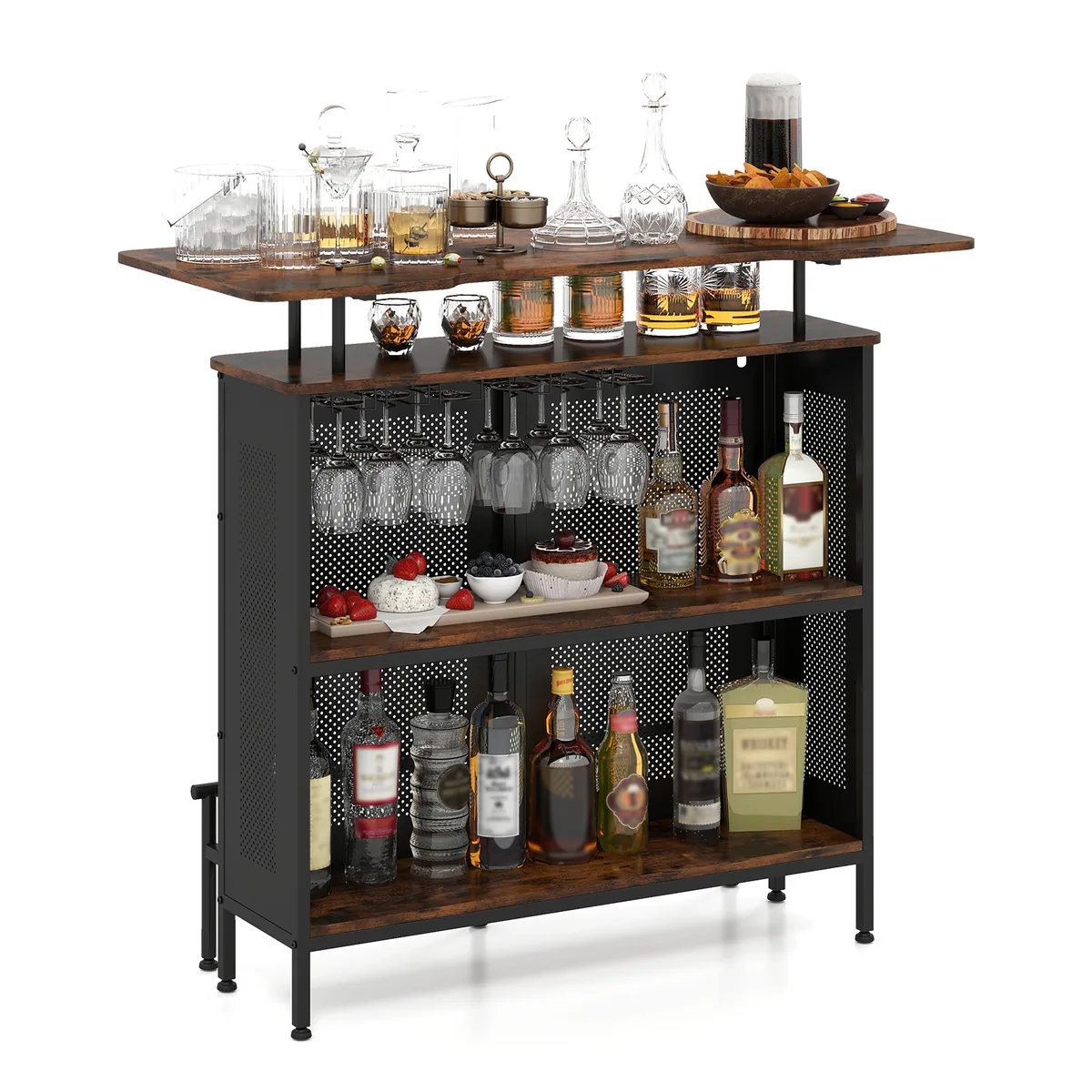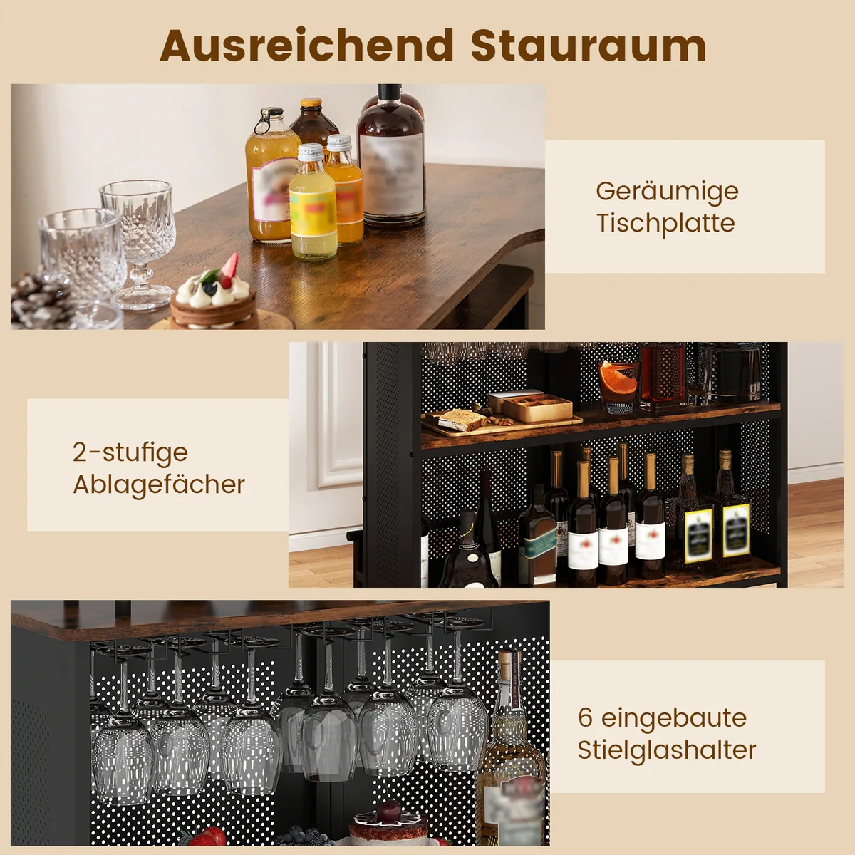 • Didelė vieta gėrimams ir baro reikmenims – stalviršis, lentynos ir kotelių laikikliai.