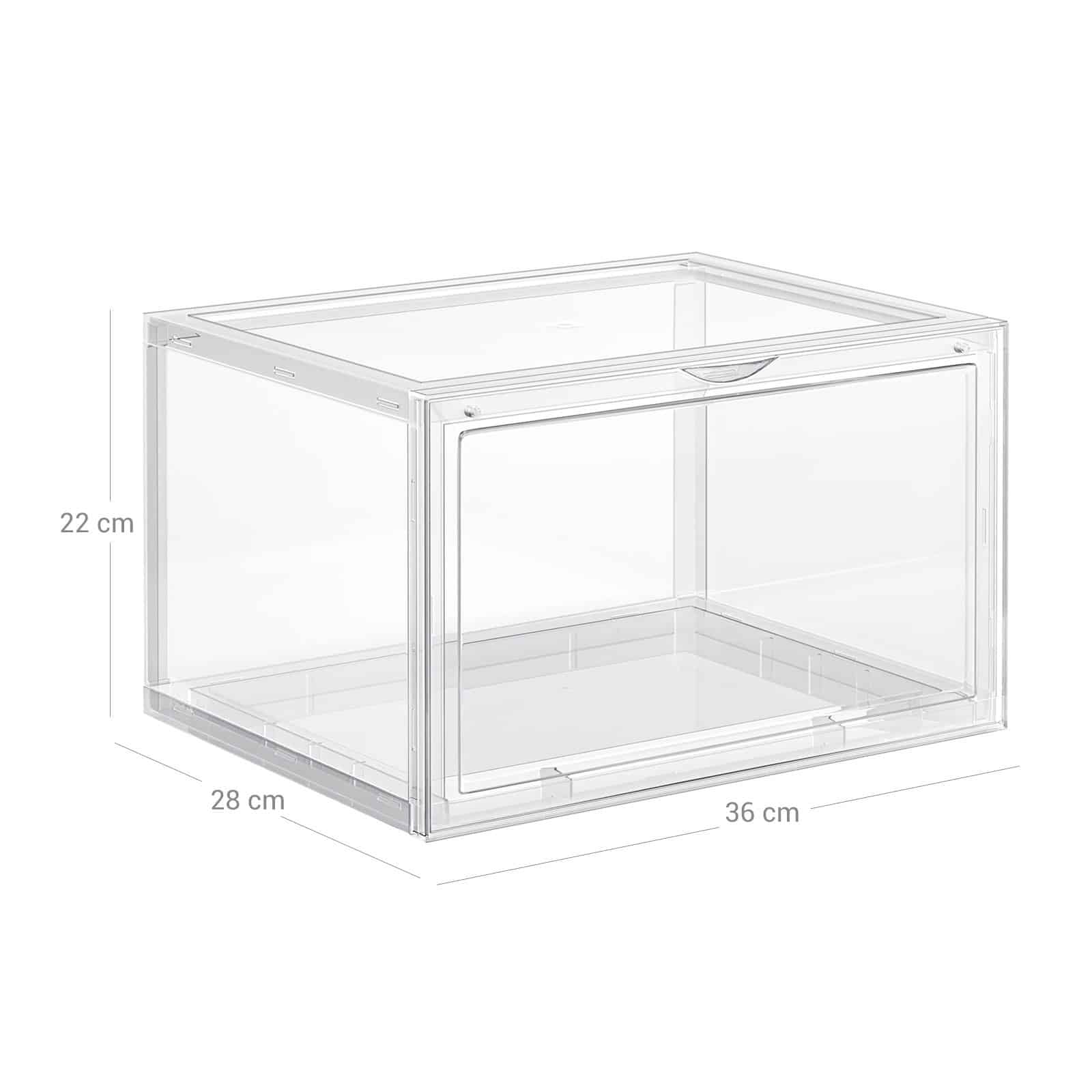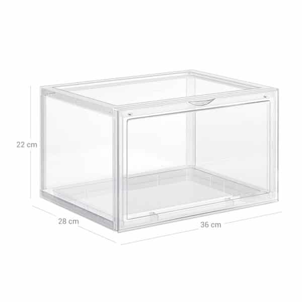 Šios batų dėžutės tinka įvairiems batams iki 46 dydžio – nesvarbu, ar tai sportbačiai, aukštakulniai ar kulkšnies batai. Jos puikiai tinka šiose plastikinėse dėžutėse ir leidžia stilingai pristatyti jūsų batus.