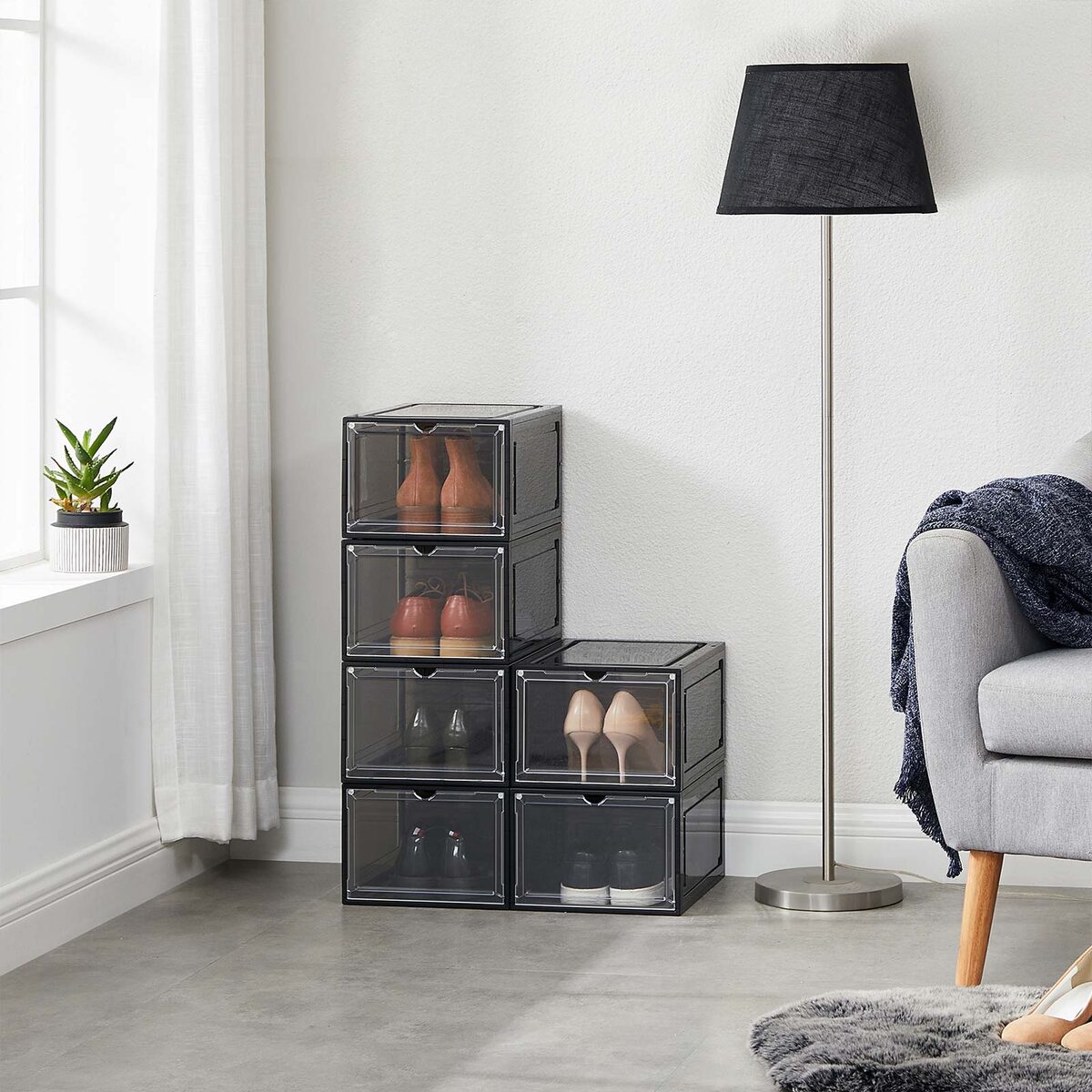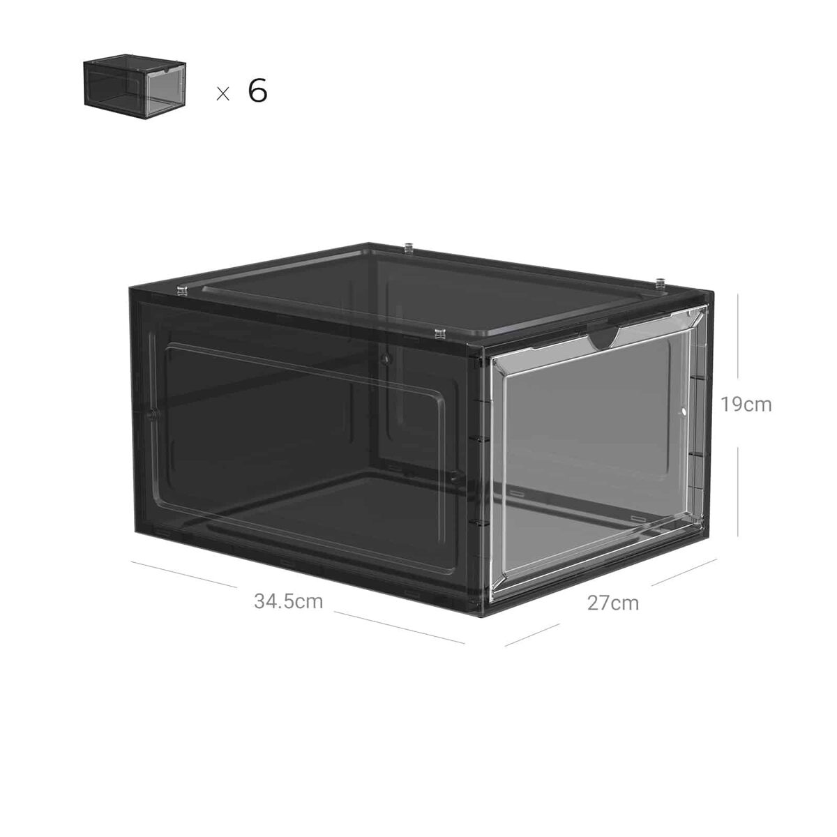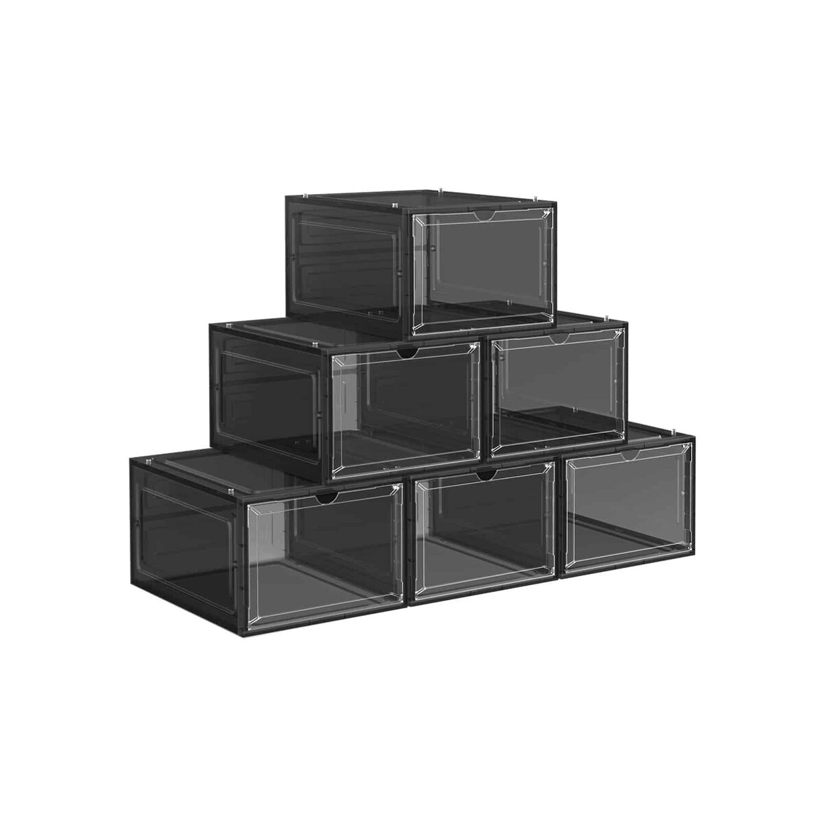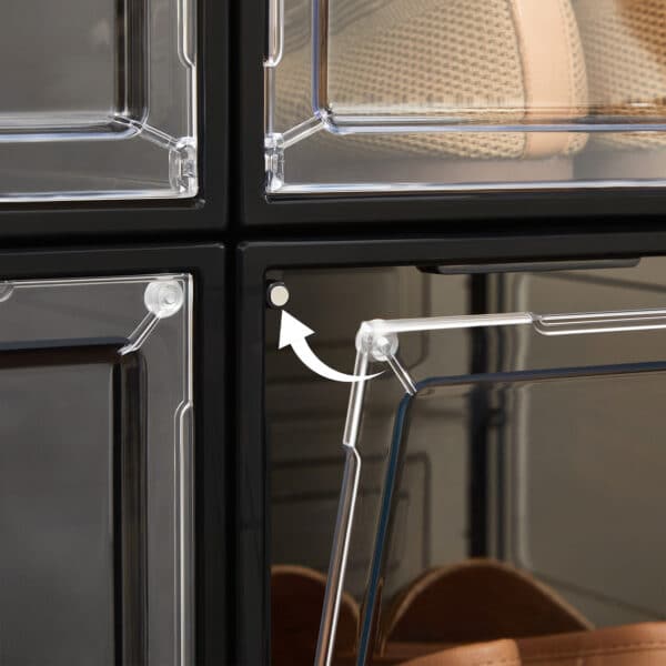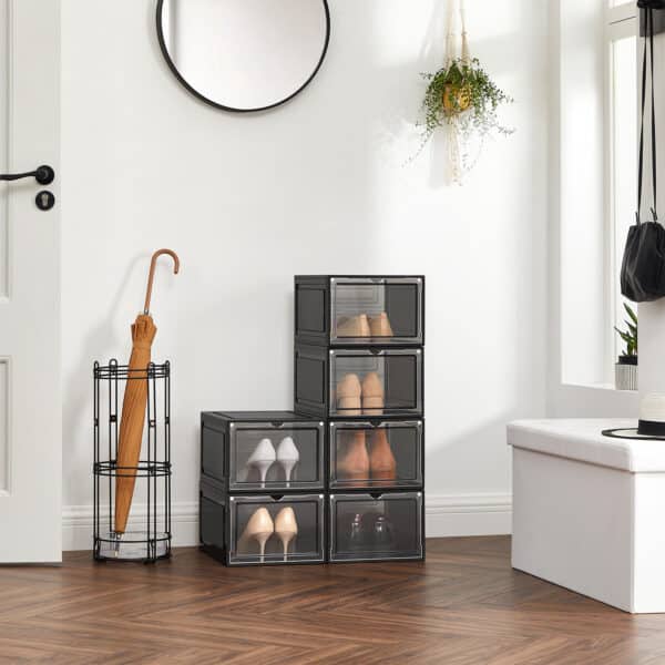 Sukraunamos plastikinės batų dėžutės iš SONGMICS – Maži aksesuarai, didelis efektas! Šios skaidrios dėžutės ne tik pašalina batų chaosą jūsų namuose, bet ir leidžia iš pirmo žvilgsnio rasti batus, kurie šiandien dera prie jūsų aprangos. Be to, praktiškos durelės leidžia lengvai prieiti prie šių batų.
