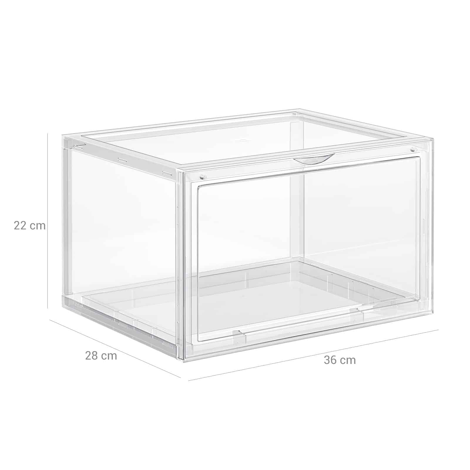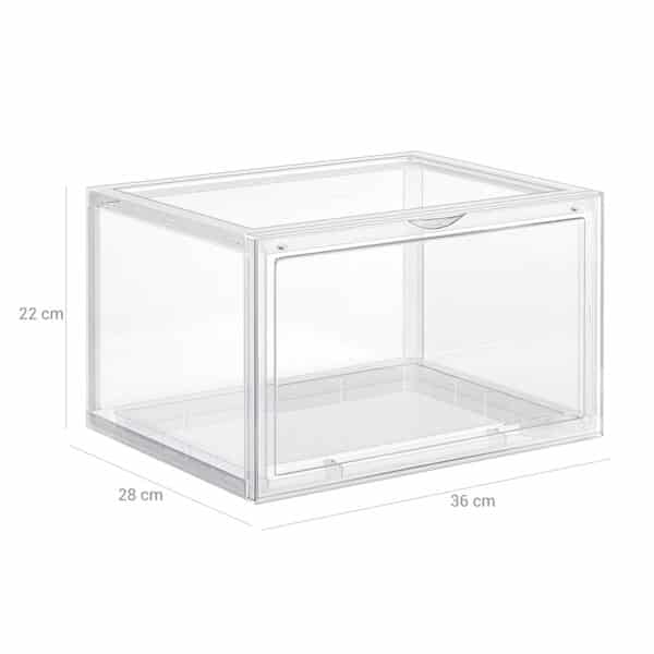 Kiekviena dėžutė yra pagaminta iš aukštos kokybės plastiko, kuris užtikrina ilgaamžiškumą ir atsparumą kasdieniam naudojimui. Dėžutės yra lengvai valomos, todėl jūsų batai visada bus švarūs ir tvarkingi.