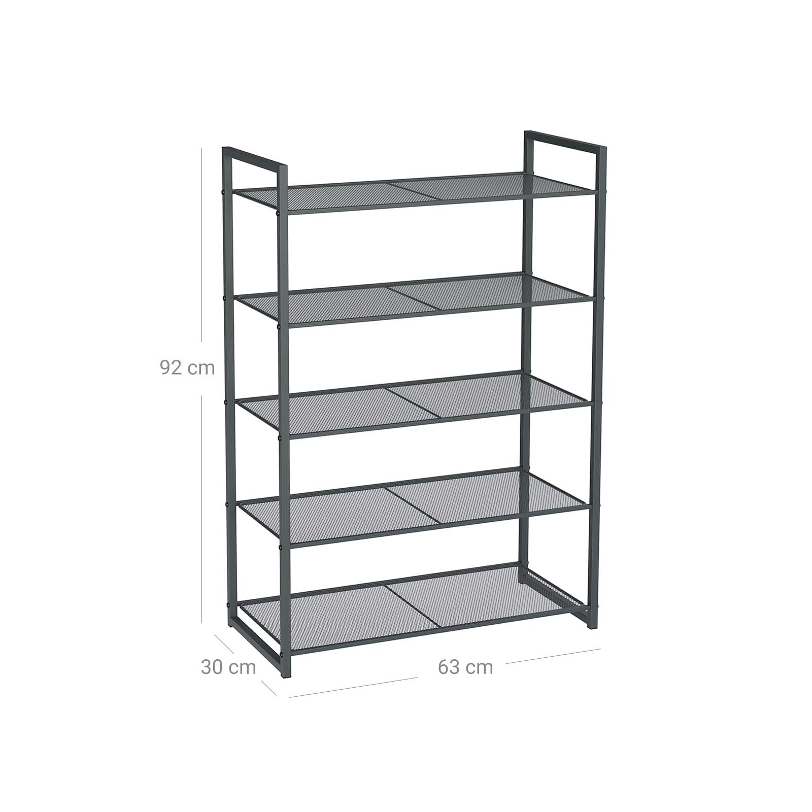 Ši batų lentyna su 5 tinklelio lentynomis yra puikus sprendimas tvarkingai laikyti batus ir kitus daiktus. Jos moderni medžio anglies pilka spalva puikiai derės prie bet kokio interjero.
