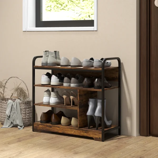 Ar jums visada trukdo batai? 4 pakopų HOMCOM batų lentyna yra sprendimas. Su aukštesne lentyna šone, idealiai tinkanti prie aukštakulnių ar aulinių batų, ji išlaiko tvarką. Atviras dizainas leidžia akimirksniu rasti batus ir išlaikyti juos švarius bei šviežius. Atsisveikinkite su batų chaosu ir pasisveikinkite su stilinga organizacija su HOMCOM pramonine batų lentyna. Puikiai tinka tvarkingiems namams!
